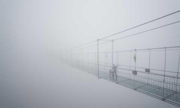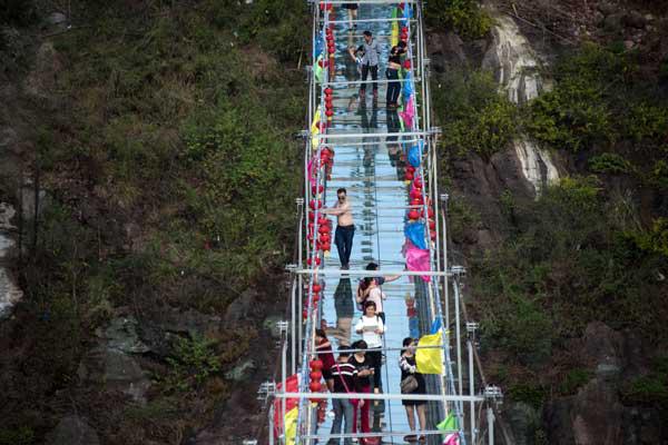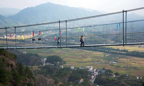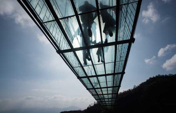 يجذب الجسر الزجاجي في الصين منذ تدشينه الاف الزوار، يعبرون في رحلة لا تنسى، يشعرون فيها بالدوار والقشعريرة والخوف وهم يبصرون تحت اقدامهم هاوية سحيقة وكأنهم يمشون في الهواء.