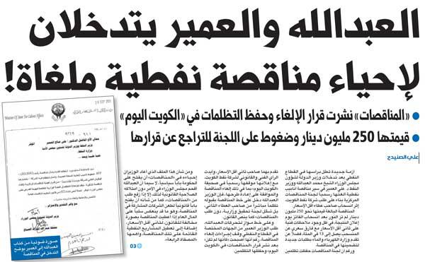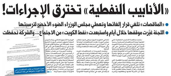 طوي ملف مناقصة "الأنابيب النفطية" بتأكيد رئيس الوزراء سمو الشيخ جابر المبارك للنائب أحمد القضيبي، خلال عرض الأخير مستندات المناقصة على سموه على هامش جلسة افتتاح دور الانعقاد الحالي بحضور بعض الوزراء، أن الملف برمته سيحال إلى ديوان المحاسبة للاطلاع ومراجعة الإجراءات الحكومية قبل اتخاذ أي قرار بهذا الشأن.وأثارت "الجريدة" الشبهات المتعلقة بالمناقصة بالمستندات خلال الأسابيع الماضية، والتي كانت مثار استغراب المتابعين لما شابها من إجراءات غير مسبوقة في مجلس الوزراء ولجنة المناقصات المركزية.