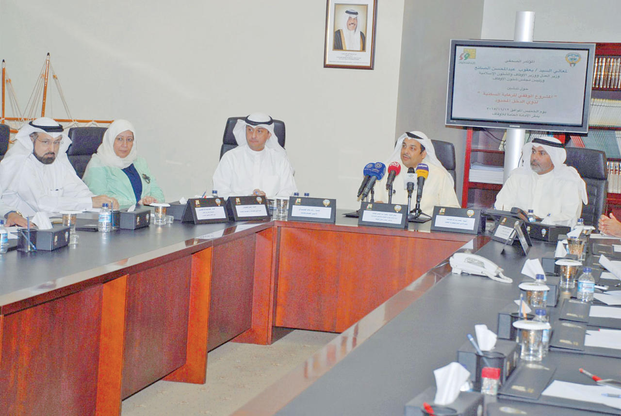 أعلن وزير العدل وزير الأوقاف والشؤون الإسلامية يعقوب الصانع، عن «تدشين أعمال المشروع الوقفي للرعاية السكنية كمبادرة كريمة من الأمانة العامة للأوقاف، لسد حاجات بعض الأسر الكويتية غير القادرة على تحمل بعض نفقات السكن، وكلنا أمل أن يكون المشروع نموذجاً يحتذى به وتجربة ثرية في خدمة المجتمع والعمل الخيري والوقفي».وقال الصانع في مؤتمر صحافي عقده، أمس، في مقر الأمانة العامة للأوقاف للإعلان عن تدشين مشروع الوقف الإسكاني، انه «في ضوء الاهتمام الكبير والتوجيهات السامية لسمو أمير البلاد الشيخ صباح الأحمد بحل القضية الإسكانية، وانطلاقاً من توجيهات سموه في حل مشاكل المواطنين والاهتمام بشؤونهم، فقد أنشأت الأمانة العامة للأوقاف المشروع الوقفي للرعاية السكنية بهدف مساعدة ذوي الدخل المحدود من المواطنين الذين يعجزون عن إيجاد السكن الذي يليق بالأسرة الكويتية باعتباره عامل استقرار مهم لكل أسرة ويسهم في رفع مستوى المعيشة، ويوفر الاستقلالية للأسرة لتحقق بذلك الكثير من الآمال والتطلعات لأفرادها».