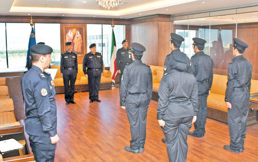 ونقل الفريق الفهد إلى الخريجين الخمسة تهنئة وتحيات نائب رئيس مجلس الوزراء وزير الداخلية الشيخ محمد الخالد، مؤكدا أن الوطن أمانة في أعناق أبنائه، وأن عليهم مواصلة التزود بالعلم ومخافة الله وصون الأمانة والالتزام بالقسم الذي أدوه، حتى ينعم الجميع بالأمن والأمان. وشدد الفهد على أهمية الاستفادة من خبرات من سبقوهم، وضرورة مضاعفة الجهد والعطاء وتطوير الأداء الأمني، والعمل على اكتساب المهارات والخبرات الجديدة، مؤكدا أن الطريق مفتوح أمام الجميع للترقي، بشرط المثابرة والعمل الجاد، مبرزا أهمية تطبيق القانون على الجميع، وأن الاحترام والتقدير أسس التعامل مع المواطنين والمقيمين.وأشار إلى أنه لابد من ترجمة شعار الولاء للوطن إلى سلوك ملموس، وأن أمن الوطن واستقراره هو غايتنا.وأصدر الفهد قرارا بتعيين خريجي معهد ضباط الصف بأول مربوط رتبة رقيب أول اعتبارا من 20/ 9/ 2015، وقرارا بتعيين خريجة معهد الشرطة النسائية بقوة الشرطة بأول مربوط رتبة شرطي اعتبار من 13/ 9/ 2015.