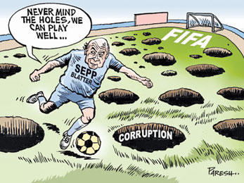 نشر العديد من الصحف العالمية رسومات ساخرة تجاه الاتحاد الدولي لكرة القدم والرئيس بلاتر ، وقام الرسام باريش برسم ملعب كرة قدم مليء بالحفر (قاصدا بذلك الفساد)، والسويسري جوزيف بلاتر يلعب في ذلك الملعب غير مكترث بالحفر وهو يقول "لا تهتم ابدا بالحفر يمكنك دائما اللعب.