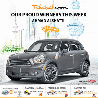انطلاقا من التزامها بمكافأة عملائها المخلصين بجوائز قيمة تفوق توقعاتهم، مازال موقع طلبات دوت كوم مستمرا بحملته الترويجية «يلا نطلب»، ويعلن أسماء الفائزين في السحب الأسبوعي الثالث للمسابقة.وكانت الجائزة الأولى لهذا الأسبوع «سيارة ميني كوبر» من نصيب أحمد الشطي. أما الجائزة الثانية فكانت من نصيب فادي ملكاوي وهي 1000 دينار نقدا. وبالنسبة إلى تذاكر السفر، ربح فهد بوقمبر تذكرتي سفر إلى دبي.
