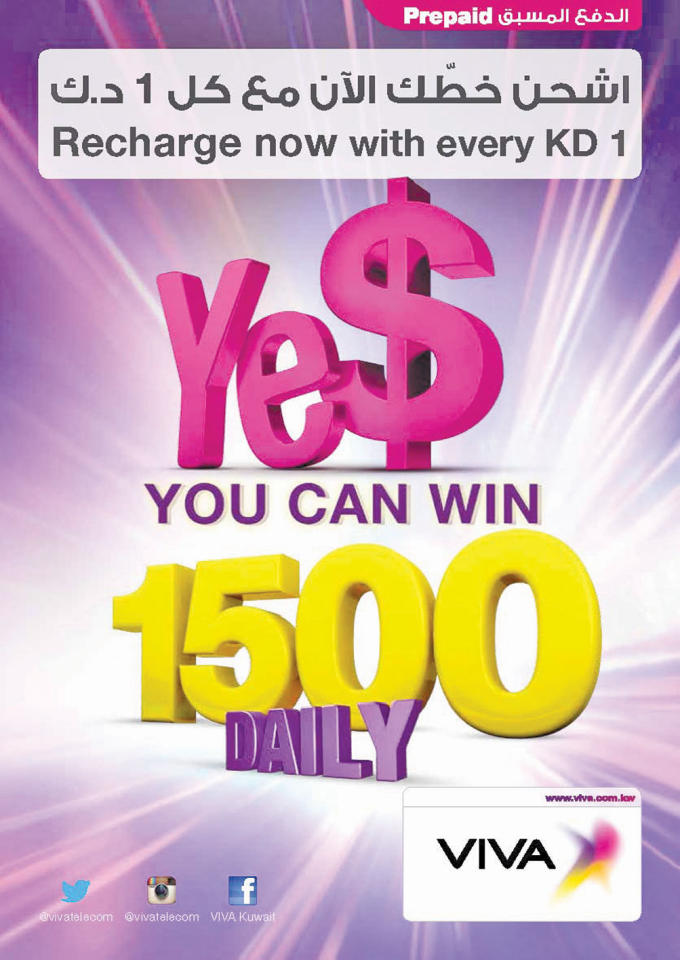أعلنت شركة الاتصالات الكويتية VIVA، مشغّل الاتصالات الأسرع نمواً في الكويت، أسماء الفائزين يومياً في السحب الخامس لحملة عملاء الدفع المسبق، التي بدأت من 28 يوليو وتستمر ستة شهور متتالية، وتمنح بموجبها العملاء فرصة الحصول على جوائز نقدية بقيمة 1500 دولار أميركي، وجوائز شهرية بقيمة 5000 دولار أميركي مقابل كل إعادة تعبئة للرصيد بقيمة دينار.وقد أقيم السحب اليومي لحملة عملاء VIVA للدفع المسبق في الأسبوع الخامس في 1 سبتمبر 2015، حيث تم منح جوائز نقدية قيمة كل منها 1,500 دولار أميركي لسبعة فائزين هم: محمد ناصر سالم الحارث، أحمد عبدالسلام محمد النجار، الوين ديسوزا، عبدالقادر يوسف بياري، ساره محسن عواض العتيبي، ساره يوسف عبدالله الغريب، سعود محيا زايد المطيري.