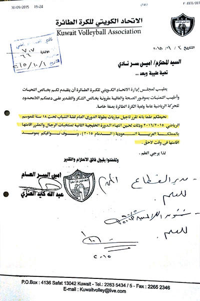 تغيب فريق كاظمة للكرة الطائرة للشباب تحت 18 سنة عن المباراة التي كان مقرراً إقامتها أمس الأول أمام نظيره التضامن في انطلاق مشواره ضمن دوري الشباب، ولم يحضر الفريق إلى الصالة حتى موعد بداية المباراة، ليتم إنهاؤها بالانسحاب لمصلحة التضامن.من جانبه، أرجع صادق القطان إداري نادي كاظمة تغيب الفريق إلى خطأ إداري من جانب الاتحاد، الذي أبلغ النادي عبر كتاب رسمي في 29 سبتمبر الماضي بتأجيل جميع مباريات دوري الشباب حتى اشعار آخر، وذلك بسبب مشاركة عدد من اللاعبين ضمن المنتخب الوطني الاول في دورة الالعاب الخليجية.