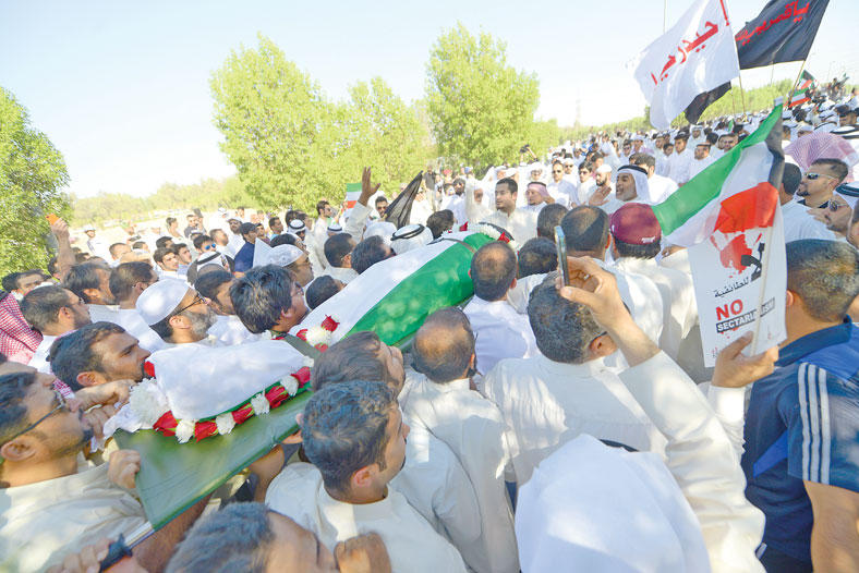 وأجمعت مواقف المشيعين على مواجهة الأحداث يداً واحدة، ولفت جثامين الشهداء بعلم الكويت قبل أن توارى الثرى وسط مواقف التنديد بالجريمة، والدعوات إلى صون الوحدة الوطنية."الجريدة" رافقت المشيعين ورصدت بعض المواقف، إذ قال الشيخ حسين المعتوق "نقدم التعازي لأهالي الشهداء الذين استشهدوا في شهر رمضان المبارك أثناء الصلاة وأثناء السجود، تغمدهم الله بواسع رحمته"، موضحا أن هذا الحادث يؤكد أن أكبر خطر يواجهنا هو خطر هؤلاء التكفيريين والخوارج، ونحن نقول لهم إن هذا الأمر لن يزيدنا إلا عزيمة وإصراراً.وأضاف "أغتنم هذه الفرصة لأشيد بموقف سمو الأمير الشيخ صباح الأحمد، الذي بادر بالحضور إلى موقع الانفجار ودوره في حفظ ودعم الوحدة الوطنية"، قائلا: "إننا مطالبون بالتماسك أكثر والوقوف في وجه الإرهاب والتصدي لهؤلاء".وذكر "نأمل أن يكون هناك مزيد من التعاون بين الشعب والسلطة لمواجهة هذا الخطر، ونسأل الله تبارك وتعالى الرحمة للشهداء والشفاء للمصابين".بدوره، قال والد الشهيد الطفل محمد الجعفر "الحمد لله رب العالمين، وإنا لله وإنا إليه راجعون. ندعو الله العلي القدير أن تكون هذه الفاجعة المؤلمة خاتمة الأحزان".وأضاف "لا نملك إلا الدعاء بالرحمة للشهداء والشفاء العاجل للمصابين"، متمنيا ألا تتكرر هذه المأساة في بلد الأمن والأمان"، مشيداً بتماسك الشعب الكويتي في مواجهة هذا العمل الإرهابي الجبان، ومؤكداً أن الشعب الكويتي بقيادته الحكيمة سيتجاوز هذه المحن.سد منيعمن جانبه، قال النائب السابق مبارك النجادة"، إن "وجود مختلف أطياف وشرائح الشعب الكويتي في المقبرة أبلغ رسالة للتكفيريين بأن الكويت ستكون سداً منيعاً أمام مخططاتهم الشيطانية".وطالب النجادة بضرورة التصدي لجميع الأصوات التكفيرية والقنوات التحريضية الطائفية التي تروج للتكفير، سواء كانت داخل أو خارج الكويت، مؤكداً أننا ببركة الروح الكويتية الواحدة المتماسكة سنفشل مؤامراتهم التي تهدف إلى هدم واستقرار هذا البلد الآمن.زعزعة الأمنمن جانبه، قال محافظ العاصمة ثابت المهنا إن من يقف وراء الحادث أراد أن يدق إسفيناً بين أبناء الشعب الكويتي، لكنه لا يعلم أن الكويتيين مرت بهم محن كثيرة تجاوزوها وتغلبوا عليها بفضل تماسكهم وتعاضدهم، وخير دليل على ذلك الغزو الغاشم، الذي أوضح أن الكويتيين لحمة واحدة.وأضاف المهنا أنه عندما قام هذا الجبان بذلك الفعل الدنيء بترويع الآمنين وتفجير المصلين كان يهدف إلى زعزعة الأمن وزرع الخوف في قلوب الناس، لكنه فشل وسيفشل بإذن الله بفضل تماسك أبناء هذا الشعب الطيب، ولعل وجود سمو أمير البلاد في موقع الحدث بعد فترة وجيزة كان أبلغ رسالة للمخربين بأن هذا الشعب الأبي لن ينكسر ولن يستسلم لمخططات الإرهابيين.وسأل الله القدير أن يرحم شهداء الكويت بواسع رحمته وأن يلهم أهلهم وذويهم الصبر والسلوان، معرباً عن أطيب الأماني للجرحى والمصابين بالشفاء العاجل. مصاب جللمن ناحيته، تقدم وزير الأشغال العامة السابق الدكتور فاضل صفر بأحر العزاء لجميع أهل الكويت بهذا المصاب الجلل الذي آلم الجميع، لكن "عزاءنا أنهم يحتسبون عند الله الأجر خاصة وأنهم كانوا في بيت من بيوت الله في يوم الجمعة من شهر رمضان وأثناء أداء الصلاة".وأضاف صفر أن حضور سمو الأمير إلى موقع الحدث وفي اللحظات الأولى إنما هو دليل واضح على أبوته وعطفه وحنانه على الجميع من أبناء الكويت، مؤكداً أن مثل هذه المواقف الأبوية من سمو الأمير وكذلك سمو ولي العهد الشيخ نواف الأحمد هي محل احترام وتقدير من قبل أهل الكويت الذين لا يستغربون هذه المواقف الأبوية.وشدد صفر على ضرورة التمسك بالوحدة الوطنية، وعدم الالتفات إلى الإشاعات، وضرورة أخذ الأخبار من مصادرها الرئيسية ، داعيا الشعب إلى نبذ كل صوت ينعق بهدف إشعال فتنة الطائفية التي تعطي المجال لتغلغل من يريد السوء بأمننا.وذكر أن الكويت، كانت وما زالت وستكون عصية بإذن الله على من يعاديها أو يريد بها السوء، والشواهد على ذلك عديدة على مر ا