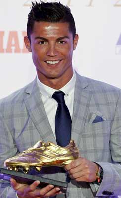 استلم اللاعب البرتغالي كريستيانو رونالدو نجم ريال مدريد الأسباني اليوم الثلاثاء جائزة الحذاء الذهبي التي تمنح لأفضل هدافي القارة الأوروبية خلال حفل أقيم بهذه المناسبة أكد خلاله رونالدو على رغبته في الفوز بجوائز جديدة على المستوى الفردي والجماعي أيضا