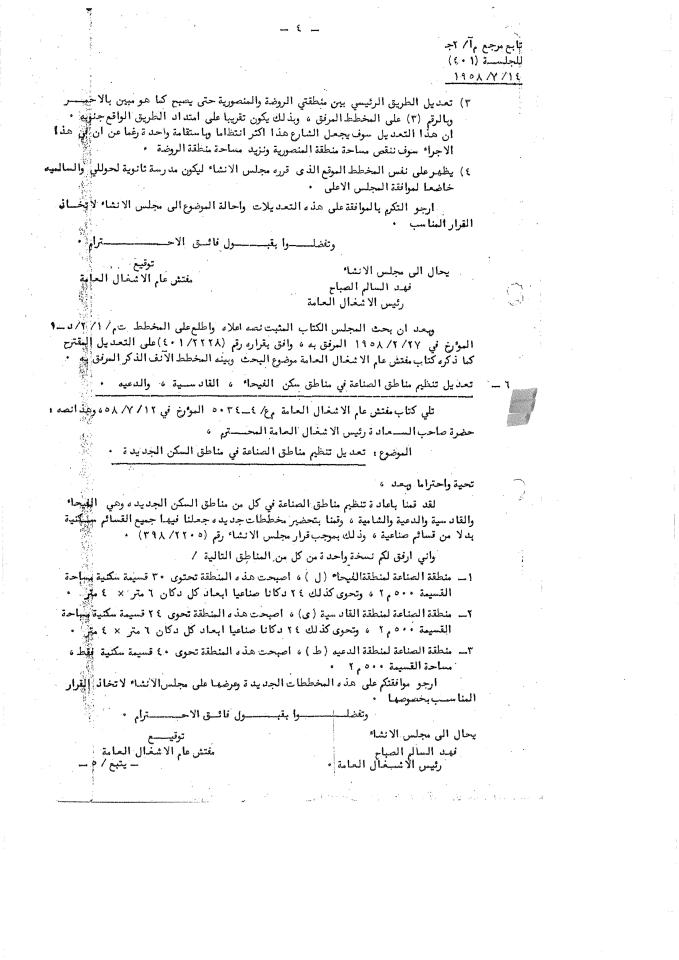في عام 1953 تأسس ما يسمى بـ"مجلس الإنشاء"، وهو مجلس حكومي معني بشؤون الإسكان من تأهيل الأراضي وتطويرها وتنظيمها وتوزيعها على المواطنين سواء كانت أراضي سكنية أو استثمارية أو تجارية أو صناعية. وقد تيسر لي قبل عدة سنوات الحصول على نسخ كثيرة وأوراق عديدة توضح ما كان يدور في جلسات هذا المجلس المهم في تاريخ الكويت بتلك المرحلة الانتقالية من كويت الماضي إلى كويت الحاضر من ناحية الإعمار والانتقال إلى الضواحي خارج سور الكويت.