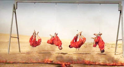 أقدم تنظيم "الدولة الإسلامية" (داعش) على حرق أربعة عناصر من ميليشيات "الحشد الشعبي" الشيعية العراقية التي تقاتل الى جانب القوات الأمنية ضد التنظيم، وذلك بعد أيام من بث شريط مصور يظهر "أبو عزرائيل"، وهو مقاتل شهير في "الحشد"، يقطع أجزاء من جثة محترقة يعتقد أنها لأحد مقاتلي التنظيم.وأظهر شريط فيديو بثه التنظيم على حسابات إلكترونية مؤيدة له، أربعة أشخاص يرتدون زيا برتقالي اللون، ويعرفون عن انفسهم بأنهم من محافظات ذات غالبية شيعية في جنوب العراق، وينتمون الى "الحشد".