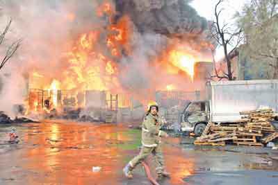 أصيب 6 اطفائيين بحالات اختناق واجهاد حراري، واصيب آخر بحروق من الدرجة الاولى في القدمين جراء حريق ضخم اندلع ظهر امس في مصنع للزيوت في منطقة الاحمدي الصناعية، ثم امتد الحريق الى مصنع زجاج مجاور له، الامر الذي زاد من رقعة الحريق وزاد من الصعوبات على رجال الاطفاء.وقال مدير ادارة العلاقات العامة والاعلام بالانابة في الادارة العامة للاطفاء المقدم احمد الديحاني ان غرفة عمليات الادارة العامة للاطفاء تلقت بلاغا ظهر امس يفيد باندلاع حريق في مصنع للزيوت في المنطقة الصناعية بالاحمدي، مشيرا الى ان المبلغ افاد بان الحريق انتقل بسرعة كبيرة الى مصنع زجاج مجاور لمصنع الزيوت.