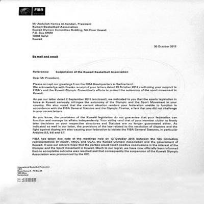 فمن المتوقع أن يتلقى اتحاد السلة كتابا من نظيره الدولي يفيد بتعليق نشاط السلة الكويتية على المستوى الخارجي، كونه واحدا من الاتحادات التي يوجد فيها العديد من الحلفاء للمنتفعين من الرياضة داخل الكويت، لكن المستغرب هو إشارة مسؤولي الاتحاد الدولي للكتاب الذي تلقوه في 23 أكتوبر الماضي من الاتحاد الكويتي، والذي تضمن الإشادة باللجنة الأولمبية الكويتية ومساندتها في موقفها، ما يعني بكل ببساطة أن الاتحاد ضد القوانين الكويتية، وأنه واحد ممن اسهموا بفاعلية في تعليق النشاط. وتحول رئيس اتحاد كرة السلة عبدالله الكندري من داعم ومساند لرئيس اللجنة الأولمبية الكويتية إلى محرض على تعليق النشاط الرياضي بصفة عامة، وكرة السلة بصفة خاصة، من خلال الكتب التي يرسلها إلى الاتحاد الدولي للعبة، والتي يرسلها بشكل منفرد دون اطلاع أعضاء مجلس الإدارة عليها.