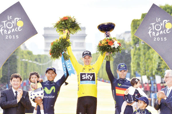 توج البريطاني كريستوفر فروم بلقب دورة فرنسا الدولية للدراجات الهوائية، امس الاول عقب المرحلة الحادية والعشرين الاخيرة بين سيفر-غران باريس سين اويست وجادة الشانزيليزيه في العاصمة باريس على مسافة 109.5 كلم.وضمن فروم تتويجه باللقب منذ وصول كوكبة السباق الى جادة الشانزيليزيه، حيث قررت اللجنة المنظمة وقف توقيت المرحلة 21 الاخيرة اعتبارا من اللفات العشر الاخيرة في الجادة وذلك بسبب المطر.