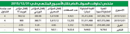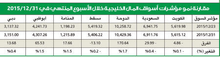 من أهم الأخبار المؤثرة على كل أسواق المال الخليجية والسعودي، إعلان موازنة 2016 وميزانية 2015، حيث جاءت الأرقام قريبة من التقديرات، وبالتالي لم تكن لها اثر قرار رفع أسعار الطاقة في المملكة العربية السعودية، وهو ذو أثر على مؤسسات القطاع الصناعي والنقل بشكل واضح، حيث انه أهم مدخلات الإنتاج، وارتفاع سعره سيرفع من تكلفة المنتجات والخدمات بنسب متفاوتة لتؤثر على مجريات السوق السعودي في حينه. وينتقل الأثر على معظم مؤشرات الأسواق الخليجية، واستوعب بعضها مدى اثر القرار، إذ إن الاقتصاد الإماراتي حرر اسعار الطاقة قبل ذلك، وانتهى السوق من حساب الاثر في حينه، لترتد الأسواق ويسجل السوق السعودي اكبر خسارة له خلال الأسبوع لم يستطع استعادتها كاملا في بقية جلساته، وانتهى بخسارة بنسبة 0.4 في المئة تعادل نحو 30 نقطة ليقفل على مستوى 6911.76 نقطة، رافعا خسارته السنوية لعام 2015 إلى 17 في المئة، والشهرية نسبة 4.5 في المئة.الكويتي ومسقط وسجلت مؤشرات سوق الكويت للاوراق المالية خسائر محدودة، حيث تراجع المؤشر السعري بعُشر نقطة مئوية تعادل 4.86 نقاط ليقفل على مستوى 5615.12 نقطة، وبذات النسبة تراجع المؤشر الوزني، حيث فقد 0.28 نقطة ليستقر قريباً من مستواه السابق على 380.71 نقطة، وفقد مؤشر كويت 15 عُشر نقطة مئوية تعادل 2.09 نقطة ليقفل على مستوى 900.4 نقطة.وبين محاولة إقفالات سنوية خلال الجلسات الأخيرة من السنة، وبين تبادل بين محافظ وصناديق بتداولات موسمية، ارتفعت سيولة ونشاط جلسات الأسبوع الأخير عما قبله، مع الأخذ بعين الاعتبار فرق الجلسات، حيث هناك جلسة زائدة لصالح الأسبوع الأخير، بما ان الأسبوع السابق بـ4 جلسات فقط، ونمت السيولة بنسبة 44 في المئة، ما ارتفع النشاط بنسبة 74.5 في المئة، وكان لسهم تمويل خليجي الفضل الأكبر بعد عدوله عن الانسحاب من البورصة الكويتية، ليرفع النشاط ويسري على بعض الأسهم المضاربية، ولكن لجلستين فقط، عاد بعدها الهدوء بنهاية جلسات العام، ولعبت الإقفالات دورا بارزا في تعويض خسائر بداية الأسبوع، خصوصاً في الجلسة الأخيرة.واستمر الأداء السلبي في سوق مسقط بسبب تداعيات أسعار النفط التي مازالت تعاني وتتداول عند أدنى مستوياتها، ليفقد مؤشر سوق مسقط عُشري نقطة مئوية تعادل 13.1 نقطة، ليقفل على مستوى 5406.22 نقاط.قطر والإمارات يستمراناستمرت حالة الارتداد في مؤشرات أسواق الإمارات وقطر، وانضم اليهما مؤشر سوق المنامة أيضاً، حيث حقق مؤشر سوق قطر ارتفاعا بنسبة 1.7 في المئة تعادل 170.64 نقطة، ليستمر في النمو بعيداً فوق مستوى 10429.36 نقطة، وكانت حالة الاستقرار لأسعار النفط حول مستوى 36 دولارا للنفط الخام الأميركي أعطت بعض الأمل بالارتداد من هذا المستوى. وكانت مكاسب سوقي الإمارات أقل، حيث ربح أبوظبي نسبة 1.5 في المئة تعادل 65.53 نقطة، ليقفل على مستوى 4307.26 نقاط، واكتفى دبي بنسبة 0.4 في المئة تعادل 13.68 نقطة، ليقفل على مستوى 3151 نقطة، بانتعاشة من القطاعين العقاري والسياحي بعد تدفق السياح إلى دبي خلال فترة أعياد نهاية العام.وعاد مؤشر سوق المنامة ليرتد محققاً مكاسب جيدة هي الأفضل له خلال الأشهر الماضية، وبنسبة 1.5 في المئة تساوي 17.66 نقطة، ليقفل على مستوى 1215.89 نقطة، وبعد تراجعات مستمرة بسيولة منخفضة خلال فترات الربع الأخير من العام المنصرم.