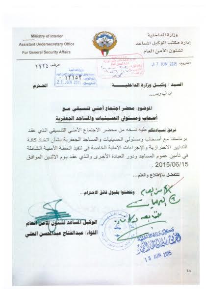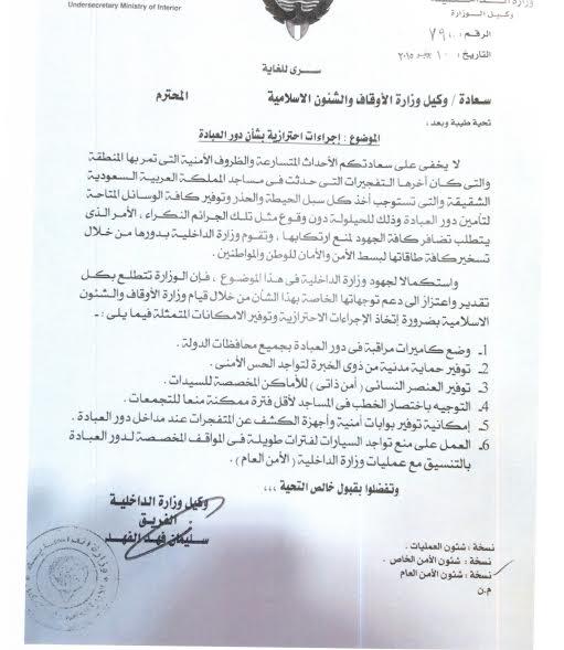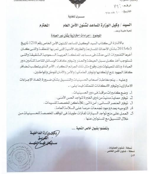 وأضافت الوزارة في بيان صحافي بأن الوزارة سبق وأن بينت بأنها اجتمعت للتنسيق مع كافة الطوائف الدينية من أجل تأمين دور العبادة.جاء نص البيان كالتالي:على الرغم من نفي وزارة الداخلية في بيان لها حول ما ذكرته بعض الصحف ومواقع التواصل الاجتماعي عن أن الأجهزة المعنية بوزارة الداخلية تلقت قبل أربعة أيام معلومات عن استهداف دور العبادة في البلاد والتي لم تعرها الاهتمام اللازم وتأكيدها على أن الوزارة لا يمكن أن تتجاهل أي معلومات تمس أمن الوطن والمواطنين مشددة في الوقت ذاته على أن رجال الأمن يؤدون دورهم على أكمل وجه حماية للوطن ومواجهة أي خطر أو تهديد محدق بكل الحزم والشدة.وتأكيداً على ذلك، أوضحت وزارة الداخلية في بيان لها مدعم بالوثائق والاستعدادات والاجراءات الاحترازية والوسائل الوقائية التي اتخذتها من خلال الاجتماع والتنسيق مع كافة الطوائف الدينية لبيان حقيقة ما سبق أن اتخذته من خطط واجراءات أمنية من خلال التعاون والتنسيق مع وزارة الأوقاف والشئون الإسلامية واللجنة الاستشارية للوقف الجعفري ورؤساء الكنائس لكافة الطوائف المسيحية وكذلك الاجتماع مع كبار قيادات طائفة البهرة وتأكيد وكيل وزارة الداخلية الفريق سليمان الفهد الذي عقد اجتماعات مع جميع الطوائف الدينية بلا استثناء بأن أمن وسلامة دور العبادة مسئولية الجميع وألا يجب أن يستغل الدين في شق الصف وزعزعة الاستقرار والوحدة الوطنية.وقد واكبت الإدارة العامة للعلاقات والإعلام الأمني تلك الاجتماعات ونشرتها تباعاً عبر كافة وسائل الإعلام بالكلمة والصورة في التواريخ التالية:· 1/6/2015 اجتماع وكيل الوزارة وبحضور كبار القيادات الأمنية مع وكيل وزارة الأوقاف والشئون الإسلامية الدكتور عادل الفلاح ووكلاء وزارة الاوقاف المساعدين.· 1/6/2015 عقد وكيل وزارة الداخلية الفريق سليمان الفهد وبحضور كبار القيادات الأمنية اجتماعاً مع عضو اللجنة الاستشارية للوقف الجعفري بشأن الاجراءات الاحترازية والوسائل الأمنية لحماية الحسينيات وسلامة المصلين.· 2/6/2015 عقد وكيل وزارة الداخلية الفريق سليمان الفهد وبحضور كبار القيادات الأمنية اجتماعاً مع روؤساء الكنائس لكافة الطوائف المسيحية.· 4/6/2015 عقد وكيل وزارة الداخلية الفريق سليمان الفهد وبحضور كبار القيادات الأمنية اجتماعاً مع ممثلى طائفة البهرة.وقد صدرت عن وكيل الوزارة الفريق سليمان الفهد تعليمات مشددة بموجب الكتاب رقم (794) بتاريخ 10/6/2015 للوكلاء المساعدين لشئون الأمن الخاص وشئون الأمن العام وشئون العمليات بضرورة المتابعة والتعامل السريع مع أية نداء يخص الإجراءات الاحترازية والوسائل الوقائية والتنسيق المشترك فيما بينهما بشأن اية مستجدات تتعلق بهذه الوسائل والتدابير الأمنية لضمان أمن وسلامة دور العبادة والمصلين. وكان وكيل وزارة الداخلية المساعد لشئون الأمن الخاص اللواء محمود الدوسري قد حدد في الكتاب رقم (1210) بتاريخ 3/6/2015 الاجراءات الاحترازية بشأن دور العبادة تحسباً لتداعيات الأحداث المتسارعة والظروف الأمنية التي تمر بها المنطقة والتي تستوجب أخذ كل سبل الحيطة والحذر وتوفير كافة الوسائل المناسبة لتأمين دور العبادة وذلك للحيلولة دون وقوع مثل تلك الجرائم الإرهابية النكراء الأمر الذي يتطلب تضافر كافة الجهود لمنع ارتكابها وتوفير كافة أساليب الطمأنينة والأمن والأمان للوطن والمواطنين حيث تم مخاطبة أصحاب الحسينيات والتنسيق بشأن اتخاذ الاجراءات الاحترازية وتوفير الامكانيات الممثلة في الآتي:· وضع كاميرات مراقبة في دور الحسينيات.·توفير حماية مدنية من ذوي الخبرة لتواجد الحس الأمني لدي الجميع.·توفير العنصر النسائي "أمن نسائي" للأماكن المخصصة للسيدات.·العمل على منع تواجد السيارات لفترات طويلة في المواقف المخصصة للحسينيات من خلال التنسيق مع المسؤلين عنها.وقد خاطب وكيل وزارة الداخلية الفريق سليمان الفهد وكيل وزارة الأوقاف والشئون الإسلامية الدكتور عادل الفلاح بالكتاب رقم 795 بتاريخ 7/6/2015 حد