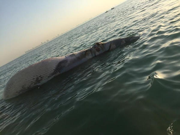 تلقت إدارة شرطة البيئية التابعة لقطاع الأمن العام بلاغاً بوجود حوت نافق في جون الكويت وبناءً على توجيهات مدير الإدارة المقدم حسين العجمي تم الانتقال إلى موقع البلاغ بالتعاون مع الإدارة العامة لخفر السواحل وتم معاينة الحوت النافق والمتواجد شرق أبراج الكويت ويبعد عن الساحل 5 ميل بحرى تقريباً.