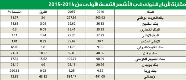 حققت البنوك المحلية العشرة نمواً إيجابياً في صافي أرباحها خلال التسعة أشهر الأولى من عام 2015 بنسبة 12.85 في المئة مقارنة بنفس الفترة العام الماضي، لترتفع من 491.05 مليون دينار في التسعة أشهر الأولى من 2014 إلى 554.17 مليونا بزيادة بلغت 63.12 مليونا.وشمل النمو جميع البنوك، حيث تصدر "الوطني" القطاع كأعلى البنوك ربحية، بأرباح بلغت 227.92 مليون دينار بزيادة 24 مليونا عن نفس الفترة العام الماضي، تلاه بيت التمويل الكويتي بقيمة 105.71 مليونا بزيادة 4.9 ملايين دينار، و"برقان" بقيمة 59.03 مليونا بزيادة 10.37 ملايين، ثم البنك الأهلي المتحد بـ39.09 مليونا بزيادة 0.39 مليون دينار، و"الخليج" بـ29.62 مليونا، بزيادة 3.09 ملايين دينار. واستحوذ "الوطني" على نصيب الأسد من إجمالي أرباح القطاع بنسبة بلغت 41.13 في المئة، تلاه بيت التمويل الكويتي بنسبة 19.08 في المئة، ثم "برقان" بنسبة 10.65 في المئة، و"الأهلي المتحد" بنسبة 7.05 في المئة، ثم بنك الخليج 5.34 في المئة، والبنك الأهلي 5.27 في المئة، و"التجاري" 4.58 في المئة، و"بوبيان" 4.54 في المئة، و"الدولي" بنسبة 2.12 في المئة، وأخيراً بنك وربة بنسبة 0.23 في المئة.ومن حيث أعلى نمو تصدر بنك "وربة" باقي البنوك بنسبة 290.6 في المئة، تلاه "بوبيان" بـ24.2 في المئة، ثم "برقان" بنسبة 21.3 في المئة، و"الكويت الدولي" بـ18.09 في المئة، وبيت التمويل الكويتي بنسبة 17.34 في المئة، و"الوطني" بـ11.77 في المئة، وبنك الخليج بنسبة 11.65 في المئة، و"الأهلي" بـ7.11 في المئة، و"الأهلي المتحد" بنسبة 1.01 في المئة، وأخيراً "التجاري" بنسبة 0.3 في المئة.ومن جانبها، أشارت مصادر مصرفية انه رغم التوترات التي تشهدها المنطقة وتأثيراتها السلبية على الأداء الاقتصادي بشكل عام، فإن البنوك حافظت على الأداء الإيجابي لها من بداية العام الجاري، حيث استطاعت زيادة صافي إيرادات التشغيل ونمو الائتمان، مع انخفاض تدريجي في إجمالي المخصصات مقارنة بالسنة الماضية.وألمحت المصادر إلى انخفاض نسبة القروض المتعثرة نتيجة تحسّن البيئة التشغيلية، ونجاح الشركات المتعثرة في السداد، بالإضافة إلى عمليات شطب بعض القروض المتعثرة، وعمليات التسويات وتسييل أصول لدفع المديونيات. وأشادت بسرعة البنوك في الإعلان عن البيانات المالية لها لفترة التسعة أشهر الأولى من العام الحالي، رغم تشدد إجراءات البنك المركزي في عمليات المراجعة والتدقيق للبيانات المالية، بالإضافة إلى تقديمه العديد من الاستفسارات إلى البنوك حول بيانتها.