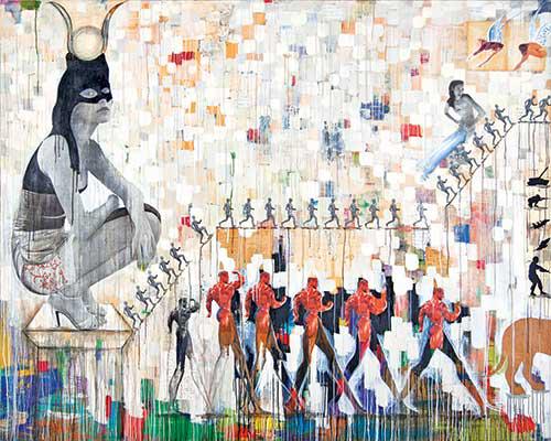 يستحضر الفنان خالد حافظ في أعماله متعددة الوسائط بشكل وضاح تصميمات تشمل صوراً من الأيقونات المصرية، والرحلات الألوهية المتجولة والعابرة بين الطرقات والمصورة على شكل شخصيات رمزية بطولية معاصرة، أو حتى من الحروب العسكرية، إضافة إلى الصور الرمزية الرائجة والمزدحمة الظاهرة في وسائل الإعلام اليوم. يريد حافظ من هذه الشكلية التكوينية أن يقدم صورة توضيحية حول التجديد القائم بين الأزمنة وأن الماضي ليس سوى تكرار مستمر يحمل في ثناياه السكينة المعرفية للزمن الحاضر، وقد يؤدي دوراً مهماً في الكشف عن الركن الخفي الواقع بين التصنع والواقع، والذي يعرفه الفيلسوف الفرنسي جان بودريار بقوله: {المرتبة الثالثة من التجانس} وذلك في أطروحته عام 1981 بعنوان التجانس والمحاكاة، ويؤكد بودريار هنا بأن ثقافة ما بعد الحداثة نمت بشكل اتكالي على نماذج أصلية بدائية ولم تعد قادرة على التمييز ما بين العالم الطبيعي ونظيره المزيف والمصنع.يصور حافظ وجهة نظر بودريار السابقة من خلال ابتكار أشكال مجسمة ومؤنسنة تضيف إلى عمله مظهراً مستقبلياً، فيها ميل واضح نحو النزاع الجمالي، فعمله الفني خال من القيود التقليدية التكوينية والامتثالات اللونية، ومن الممكن في لحظة أن يستشعر المتفرج بحركة رشيقة على سطوح لوحاته التصويرية تذكر بتلك المحفورة على جدارن المعابد القديمة.