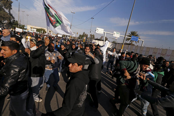 وقال الخزعلي ، امام المئات من المتظاهرين من اتباع فصائل المقاومة الاسلامية التي خرجت اليوم في مظاهرات للتنديد بإعدام الشيخ نمر باقر النمر في السعودية «على السلطة القضائية تنفيذ احكام الاعدام التي صدرت بحق السعوديين المدانين بجرائم الارهاب في العراق لانهم اراقوا دماء العراقيين الابرياء وكفي تهاونا بدماء العراقيي».وأضاف: «نحذر الحكومة العراقية وكل من تسول له نفسه اطلاق سراح المعتقلين السعوديين في العراق وسنرد على ذلك وعلى الحكومة العراقية قطع علاقاتها الدبلوماسية مع السعودية». وحمل المتظاهرون ، الذين ارتدي بعضهم الملابس العسكرية وتقدمهم نواب شيعة في البرلمان العراقي ورجال دين معممين وقيادات فصائل المقاومة ، صورا لرجل الدين السعودي نمر باقر النمر واعلام العراق والفصائل الملونة وهتفوا بشعارات تطالب بقطع العلاقات الدبلوماسية بين العراق والسعودية وطرد السفير السعودي من العراق وسحب سفير العراق من الرياض واعدام السعوديين في السجون العراقية المتورطين في جرائم الارهاب وايقاف التبادل التجاري بين البلدين وتحريم استيراد البضائع السعودية.واكتظت ساحة التحرير بالمتظاهرين الذين يمثلون عصائب اهل الحق ومنظمة بدر وكتائب جيش الامام في ظل اجراءات أمنية مشددة وقطع الطرق والجسور وانتشار واسع للقوات العراقية.كما خرجت مظاهرات مماثلة لفصائل المقاومة الاسلامية في مدن النجف والبصرة للتنديد بإعدام الشيخ النمر.