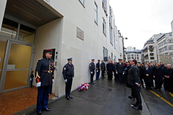 ووضع هولاند برفقة رئيسة بلدية باريس آن ايدالغو اكليلاً من الورد تحت اللوحة التي حملت اسماء الضحايا الثمانية من أسرة تحرير الصحيفة الذين قتلوا في عملية إطلاق نار قام بها جهاديون على مكاتب الصحيفة.ثم دشن الرئيس الفرنسي لوحة تذكارية ثانية في المكان الذي قتل فيه شرطي قرب موقع حصول المجزرة في السابع يناير.وسيزيح الستار أيضاً عن لوحة ثالثة قرب متجر يهودي استهدف في التاسع من يناير 2015 في شرق العاصمة. وقبل سنة، بث شقيقان الرعب في مقر "شارلي ايبدو" عندما هاجموه بالكلاشنيكوف وأطلقوا النار على أسرة التحرير المجتمعة آنذاك، وقتلوا ثمانية من أعضاء هيئة التحرير بينهم خمسة من أشهر رسامي الكاريكاتور، وأربعة أشخاص آخرين.وردد الشقيقان سعيد وشريف كواشي أثناء فرارهما "ثأرنا للنبي! قتلنا شارلي ايبدو"، في إشارة إلى نشر الصحيفة رسوما كاريكاتورية للنبي محمد أثارت موجة استنكار كبرى بين الدول الإسلامية.وفي اليوم التالي، قتل مسلم متطرف آخر يدعى احمدي كوليبالي شرطية قرب باريس، والجمعة 9 يناير، هاجم كوليبالي متجراً يهودياً وقتل أربعة يهود قبل أن يُقتَل بدوره برصاص الشرطة، وقتل الشقيقان كواشي معاً في مطبعة بشمال شرق باريس.وخلال ثلاثة أيام، أوقعت الاعتداءات التي نفذها الجهاديون الذين كانوا أعلنوا انتماءهم إلى تنظيمي القاعدة أو داعش 17 قتيلاً.