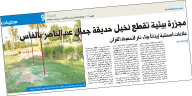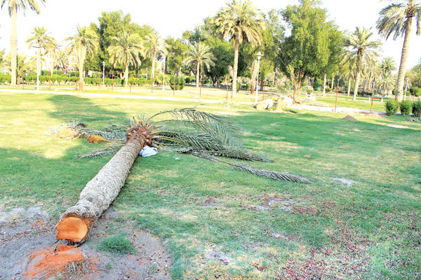 وطمأن أهالي منطقة الروضة وجميع المناطق إلى ان هذه الحدائق متنفس للجميع، ولذا فالهيئة حريصة على توفير جميع الخدمات وكذلك اعمال الصيانة للمرافق التابعة للهيئة بها، مؤكداً ان العمل في حديقة جمال عبدالناصر بالروضة سيتوقف، وأن هناك لجنة شكلت لحصر الاضرار الواقعة على الحديقة وتوقيع غرامة على المقاول الذي أقدم على قطع النخيل واستئناف العمل دون التنسيق مع الهيئة أو اخطارها. بدوره، قال مدير إدارة التنفيذ والصيانة المهندس عبدالمحسن خاجه انه في عام 2009 تقدمت وزارة الاوقاف بطلب للهيئة العامة للزراعة والثروة السمكية لتخصيص موقع في حديقة جمال عبدالناصر لإنشاء مبنى لدار تحفيظ القرآن، وان الهيئة وافقت على إعطائها الف متر مربع في الجزء الشمالي من الحديقة، مبيناً ان الهيئة اخطرت بلدية الكويت عام 2011 بتلك الموافقة.واضاف خاجه ان الجهة الطالبة للأرض اخذت موافقة من مجلس الوزراء تحت بند طلب تخصيص مواقع لإنشاء دور لتحفيظ القرآن وموفقة اخرى من الامانة العامة للمجلس البلدي، موضحاً ان «الاوقاف» ارسلت كتاباً طالبت فيه باستلام الارض المخصصة حسب الموافقات السابقة، وأن الهيئة لم يكن لديها مانع شريطة اتباع الاجراءات والانظمة المتبعة، وأن يتم الاتفاق مع «الأوقاف» والمقاول قبل إزالة أي خدمات تابعة للهيئة، غير أن الجهة الطالبة للموقع سارعت في تسلم الارض من البلدية، دون تنسيق مع الهيئة.وأشار إلى ان الهيئة عندما علمت بواقعة قطع اشجار النخيل ومجموعة من الاشجار الاخرى سارعت إلى اثبات الحالة وإيقاف المقاول عن العمل، مبيناً أن الاجراء التالي سيكون إحالة الوقعة الى لجنة اثبات الحالة في بلدية الكويت، موضحاً ان التلفيات التي تسبب فيها المقاول تقدر بـ8500 دينار.