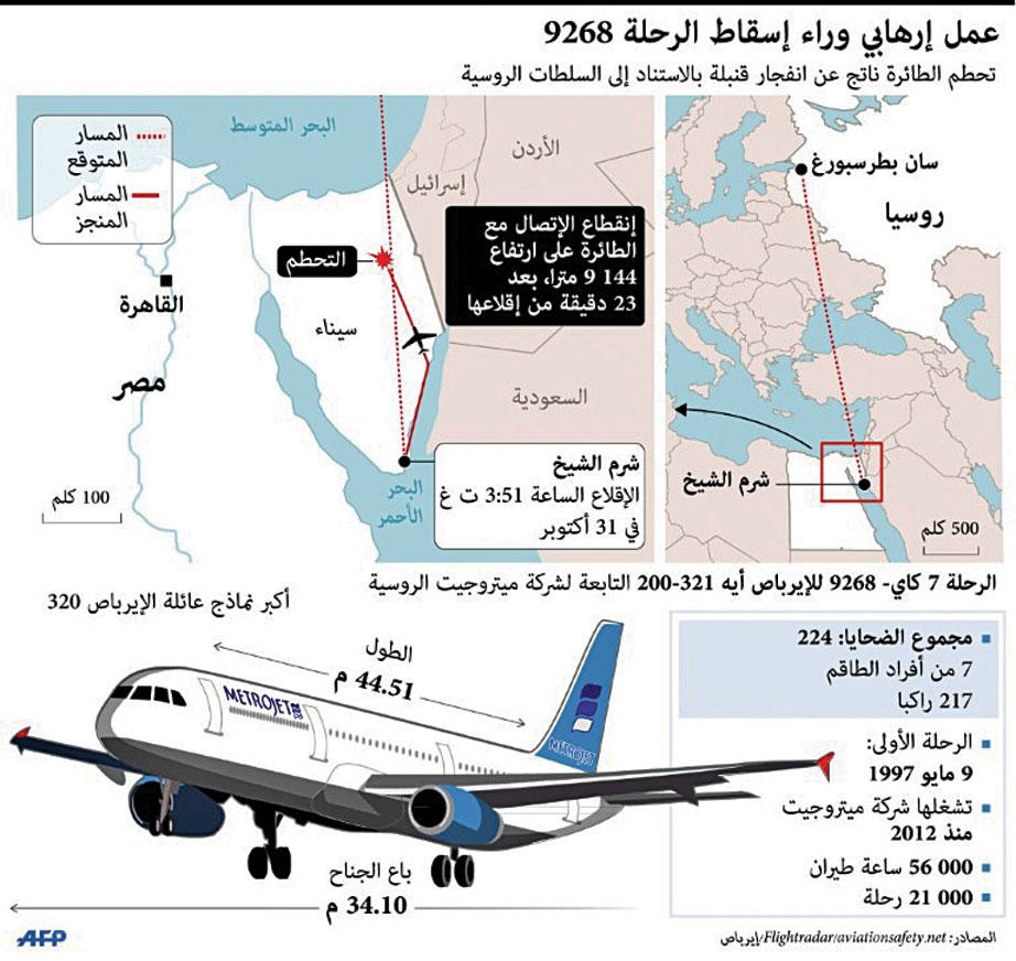 في خطوة اعتبرها مراقبون استباقاً للجنة التحقيقات الخماسية، في واقعة سقوط طائرة الركاب الروسية من طراز "إيرباص" A321 في وسط سيناء، أواخر أكتوبر الماضي، أعلن رئيس جهاز الاستخبارات الروسية "FSB" ألكسندر بورتنيكوف، أمس أن عملاً إرهابياً تسبب في تحطم الطائرة التابعة لشركة "متروجيت" في سيناء، وقتل كل من كانوا على متنها 224 بينهم 220 روسياً.وجاء في نشرة الكرملين، أن بورتنيكوف قال للرئيس فلاديمير بوتين: "يمكننا التأكيد أن الأمر يتعلق بعمل إرهابي، تم عبر زرع عبوة ناسفة يدوية الصنع تزن كيلوغراما من مادة تي إن تي شديدة الانفجار عثر على آثارها في أجزاء من حطام الطائرة ومتعلقات الركاب، وأدى انفجارها إلى تحطم الطائرة في الهواء، وهو ما يفسر سبب انتشار أجزاء من جسمها على مسافة واسعة"، بينما توعّد بوتين بالعثور على المسؤولين عن تحطم الطائرة، أينما كانوا ومعاقبتهم، وأمر الأجهزة الخاصة بالعثور عليهم.وقال بوتين: "إن روسيا، ليس للمرة الأولى، تواجه بأفعال الإرهابيين البرابرة، وعادة ما تكون هذه الأفعال دون سبب واضح، داخلي أو خارجي، وهذا ما حصل عند تفجير محطة القطارات في مدينة فولغوغراد عام 2013"، بينما رصد جهاز الأمن الروسي، مكافأة مالية قيمتها 50 مليون دولار أميركي، لمن يدلي بمعلومات تُفضي إلى القبض على المسؤول عن تفجير الطائرة الروسية.وزعمت جماعة "ولاية سيناء" التي بايعت تنظيم "الدولة الإسلامية" المعروف بـ"داعش" المسؤولية عن إسقاط الطائرة، لكنها لم تكشف الكيفية التي قامت بها.حذر مصريفي المقابل، واصلت القاهرة الحذر تجاه فرضية إسقاط الطائرة بواسطة قنبلة رجحتها تقارير استخباراتية بريطانية وأميركية في وقت سابق.وقال رئيس الوزراء شريف إسماعيل عقب الاجتماع الحكومي الأسبوعي الذي عقد في شرم الشيخ، أمس، إن "مصر تقدر الألم الذي يشعر به الشعب الروسي". وأشار إلى اطلاع الحكومة على نتائج التحقيقات الروسية، مؤكداً أنها ستأخذ التحقيقات (الروسية) بعين الاعتبار".وأصدرت الحكومة بياناً قالت فيه إنها لم تتوصل بعد لدليل يثبت أن عملا جنائيا أسقط الطائرة الروسية، في حين قال وزير الداخلية مجدي عبدالغفار انه سيتم "تشكيل مجموعات عمل أمنية لبحث سقوط الطائرة الروسية". وأعلنت وزارة الداخلية تعزيز إجراءات الأمن في مطاراتها، بالتعاون مع خبراء من بلدان وممثلي شركات الطيران، وتعزيز إجراءات تفتيش الركاب والعمال عند دخولهم المطارات، لضمان "أقصى مستوى من الأمن".من جانبه، رفض رئيس لجنة الإدارة المركزية في حادث تحطم الطائرة، أيمن المقدم، التعليق على التقارير التي أعلنتها روسيا، وقال لـ"الجريدة": إن "اللجنة مختصة فقط بتحليل الجانب الفني لسقوط الطائرة".وفي حين كانت جريدة "الجريدة" انفردت يوم الجمعة قبل الماضي، بتاريخ 6 نوفمبر الجاري، بنشر معلومات عن التحقيق مع 8 من العاملين في مطار شرم الشيخ الدولي، ورصد مشتبه فيهم، نفت القاهرة أمس ما تناقلته وسائل الإعلام وعدد من وكالات الأنباء الدولية، بشأن توقيف 17 موظفاً في ميناء شرم الجوي، يشتبه في أن اثنين منهم ساعدا من زرعوا القنبلة المفترضة، وأكد مسؤول مركز الإعلام الأمني، أمس، أن الخبر عارٍ تماماً من الصحة.وفد روسيفي غضون ذلك، قال مصدر مطلع إن اتصالات رفيعة تجري بين مسؤولين مصريين وروس، للوقوف على حقيقة الأمر، موضحاً أن مصر طلبت تقديم أدلة الاستخبارات الروسية، التي استندت إليها بشأن تحطم الطائرة بعمل إرهابي.وزير الطيران المدني المصري، الطيار حسام كمال، قال لـ"الجريدة": "ليس لدينا ما نخفيه، ولجنة التحقيق المصرية مستمرة في عملها، وروسيا لم ترسل لمصر حتى هذه اللحظات المعلومات التي تم نشرها، وأكد أنه لن يتم التعامل مع الأمر على أنه أمر واقع وسننتظر نتائج التحقيقات، ولن نُخفي أي معلومات سواء قنبلة أو غيرها".مصدر رفيع قال إن وفداً روسياً رفيع المستوى سيزور مصر خلال الساعات القليلة المقبلة، ويضم عناصر من الاستخبارات الروسية "KJB" ومسؤولين عن جهاز الأمن الاتحادي الروسي لمقابلة 