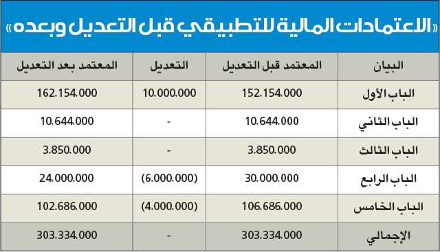 ونص التعديل الذي حصلت «الجريدة» على نسخة منه على زيادة الباب الاول الخاص بالرواتب 15 مليون دينار على حساب البابين الرابع والخامس. وتطرقت المادة الاولى من المشروع الحكومي الى الاعتمادات المالية الجديدة لابواب الميزانية بعد التعديل، فيما نصت المادة الثانية على ان تطبيق القانون يكون بأثر رجعي اي اعتباراً من الاول من ابريل 2015.