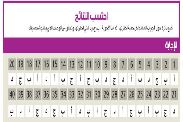2 أقول لنفسي أحياناً إن علي الاعتناء أكثر بنفسي.3 قلما أنظر إلى المرآة.4 أشعر بفضول أكبر حيال كل الأشخاص وكل المسائل.5 يرتبط الحفاظ على الشباب بحالة الإنسان الوراثية وبجيناته.6 أمنع نفسي من الإفراط في ممارسة النشاطات الجسدية.7 أمارس نشاطاً رياضياً أو اثنين وأستمتع بهما.8 لا أفكر في سني مطلقاً.9 أحاول ألا أنظر إلى الناحية الإيجابية من الأشخاص والمسائل.10 الوقت يمر ونشيخ: هذه هي الحياة.11 لا أولي اهتماماً خاصاً بمظهري.12 لا شك في أن المظهر الشاب يؤثر في نفسيتي ومعنوياتي وينعكس إيجاباً على علاقاتي.13 لدي أشغال كثيرة وجدول أعمال حافل جداً، ما يمنعني من الاهتمام بنفسي.14 أعتبر محاربة علامات الشيخوخة معركة خاسرة من البداية.15 أخشى كثيراً أن أعاني شيخوخة سريعة.16 أشعر بالرضا حيال مظهري عموماً.17 يشكل الاهتمام بالنفس والمظهر تصرفاً لبقاً ندين به للآخرين.18 لا أتقبل مطلقاً مَن يحاولون البقاء شباناً مهما كلفهم ذلك من ثمن.19 أعتني بنفسي بطريقة غير منتظمة.20 أحاول أن أكيّف مظهري مع أسلوبي الخاص وما أحبه لا مع سني.21 أشعر اليوم أنني بحال أفضل وأنني متصالح أكثر مع نفسي، مقارنة بما كنت عليه قبل عشر سنوات.22 أشعر بأسى كبير إن اضطررت أن أفصح عن سني أمام الآخرين.23 أتأرجح بين الخوف من الشيخوخة والرغبة في التقدم في السن.24 أعتبر الاعتناء بنفسي إحدى أولوياتي في حياتي اليومية.25 عندما أتأمل صوري حين كنت صغير السن، أقول لنفسي إنني كنت في وضع أفضل مما اعتقدت سابقاً.26 لا أفكر مطلقاً في الشيخوخة والتقدم في السن.27 أعتقد أن التقدم في السن مع الحفاظ على صحة جيدة ونشاط جسدي عالٍ يتطلب التحضير الجيد في مراحل الحياة الباكرة.28 لا تغرني الجراحة التجميلية... في الوقت الراهن على الأقل.29 لا أعلم إن كان وجهي يعكس سني الحقيقية أو لا.30 يشكل ضبط النفس سر التقدم في السن بشكل جيد. 31 أدرك أنني أستطيع الظهور بمظهر يوحي أنني أصغر سناً، إلا أن حافزي إلى ذلك سرعان ما يخبو.32 أحدد سن الشخص وفق اهتماماته وأسلوبه في الحياة.33 أعتبر الظهور بمظهر يوحي أنني أصغر سناً مسألة بالغة الأهمية.34 لا يمكننا منع زحف الشيخوخة، فهذه معركة خاسرة. لذلك يشكل الاستسلام الخيار الأفضل.35 لا أولي مظهر الآخرين اهتماماً كبيراً.36 بمرور الوقت، أزداد تفهماً وتسامحاً في تعاملي مع نفسي ومع الآخرين.37 تجعلني كل سنة تمر أكثر وضوحاً وجرأة.38 أنظر باستمرار إلى صورتي في المرأة.39 أنا مقتنع أننا مع التقدم في السن نخسر شيئاً من نضارتنا، إلا أننا نزداد سحراً.40 لا أملك أدنى فكرة عما قد يجعلني أبدو أصغر سناً.غالبية الأجوبة «أ» : أنت تمر بمرحلة من المقاومةما السبيل إلى الحد من تقدم الشيخوخة؟ هل أخبئ معالمها أم أجعل علامات الزمن تزول تماماً؟ تعتبر أن هذه المسألة بالغة الأهمية، لذلك تخصص لها مقداراً كبيراً من الطاقة الجسدية والنفسية. هدفك الأول طوال الوقت الحفاظ على شبابك، الظهور بمظهر شاب، والتجمد في مرحلة زمنية لا وجود معها للتغيير أو الخسارة. إخفاء التجاعيد أو التخلص منها، اتباع حميات منحفة والقيام بتمارين رياضية للحفاظ على رشاقتك وشبابك، اختيار ملابس تساعدك في إبراز «شبابك»... صحيح أن البعض يعتبرون أنماط السلوك هذه سطحية، إلا أن المجتمع يشجعها لأنها تحاول أن تهدئ مخاوفنا العميقة.في العمق: يحتل المظهر مكانة مهمة في حياتنا حين لا نشعر أننا متصالحون مع أنفسنا في أعماقنا، ليس بما فيه الكفاية على الأقل. وتظهر هذه الحالة عادةً بين مَن كانوا محور اهتمام أهلهم المفرط أو مَن حاول أهلهم تشكيلهم وفق رغباتهم وطموحاتهم. نتيجة لذلك، لا ينجحون في تخطي عقدة الآخر وما يظنه فيهم، رغم بلوغهم سن النضج. كذلك يولي هؤلاء الأشخاص اهتماماً لرأي المجتمع عموماً («البقاء شاباً») لا أشخاص محددين فحسب.وهكذا يحاولون إرضاء المجتمع بتبني مظهر وسلوك مماثلين. تشعر أن الأموال الكبيرة التي تنفقها في هذا الصدد تهدف بطريقة غير مباشرة إلى الإجابة عن السؤال الذي يعكس رغبتك الداخلية: «بماذا أرغب حقاً؟». يعكس ه