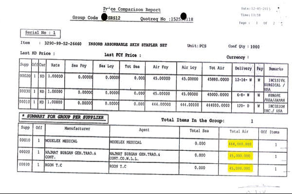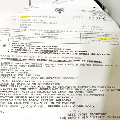 عملية تلاعبوأشار إلى أن "المستندات التي نشرتها إحدى الصحف حول المناقصة كشفت الحلقة المفقودة بالنسبة لنا في عملية التلاعب، إذ إن كتاب مقارنة الأسعار الذي وضعته الصحة حدد الكمية بالقطعة لا العلبة، وأشار بشكل واضح الى أن كل شركة قدمت عرض سعر لألف دباسة".وأضاف: "إذا افترضنا سلامة ما يقوله مصدر المناقصات المركزية، فإن ذلك يعني أن الشركة المذكورة قدمت عرضا لـ12 ألف دباسة لا ألف، كما طلبت وزارة الصحة، وبذلك فإن هذا يعني استبعاد الشركة لمخالفتها شروط المناقصة، إلا أن الصحة قامت بعمليات التقسيم والجمع والطرح على عرض الشركة حتى تجعلها أقل الأسعار". وبين أن ما قامت به "الصحة" أهدر بشكل فاضح مبادئ العدالة والمساواة بين الشركات، إذ إن الأسعار من الطبيعي أن تكون أقل بكثير إذا كان طلب الكمية مرتفعا، فهي أخذت أقل الأسعار على عرض 12 ألف دباسة، في المقابل فإن العروض الأخرى التي التزمت بطلب الوزارة كانت لألف دباسة.عرض أسعاروأفاد الصايغ بأن وزارة الصحة أرسلت طلب عرض أسعار الى الشركات في 28 مارس 2015، لاستجلاب العروض على عدد ألف دباسة، وذكرت وحدة الكمية بالقطعة "PCS" بشكل واضح، وردت الشركة على الوزارة في 11 مايو 2015 بعرضها المقدر بـ444 دينارا.ولفت الى أن كلمة SET في عرض الشركة أو الوزارة يعني الدباسة مع ملحقاتها، حسبما تذكره الشركة الأميركية المصنعة في موقعها، لا حسبما يحاول مسؤول المناقصات أو مسؤولون في الصحة إيهام الناس بأن الـSET عبارة عن 12 دباسة.وأوضح أنه "وفق ما نشر في إحدى الصحف من مستندات، وما تحصلنا عليه، فإن جميع تلك المستندات ستقدم الى هيئة مكافحة الفساد الاسبوع المقبل، لضمها الى البلاغ الذي تقدم به التحالف"، مؤكدا أن "الهدف اليوم هو حماية المال العام، ولا يهمنا أيٌّ من المشاركين في المناقصة".