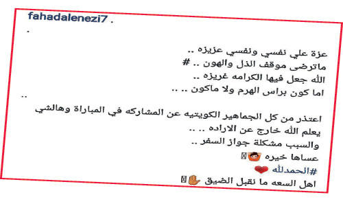 يذكر أن العنزي استبعد في وقت سابق من المشاركة في مواجهة لاوس، بسبب رفض سفارة لاوس منحه تأشيرة دخول لانتهاء جواز سفره في ديسمبر المقبل، وهو إجراء قانوني صحيح.وعلمت "الجريدة" أن الجهاز الفني لمنتخبنا الوطني، بقيادة المدرب التونسي نبيل معلول ومساعديه نادر داود ود. محمد المشعان، تمسك ببقاء اللاعب، لاسيما أن معلول وصفه من قبل بأنه الأفضل خليجياً، لكنه أصر على الرحيل من قطر قبل 48 ساعة فقط من اللقاء، وهو الأمر الذي دفع الجهاز الفني إلى تحقيق رغبته.في المقابل، تردد من مصدر قريب من العنزي أن مشاركته أمام ميانمار في التشكيل الأساسي لم تكن مؤكدة، بسبب غيابه عن لقاء لاوس، ومن ثم طالب بالعودة إلى الكويت.شركة خاصة لضاريأما اللاعب ضاري سعيد فحددت له إحدى الشركات الخاصة الكبرى موعداً أمس لإجراء مقابلة لتسلم وظيفة حسب تأكيد اللاعب لـ"الجريدة"، الذي أوضح أنه كان من الصعوبة بمكان إرجاء المقابلة.وقبل الجهاز الفني طالب اللاعب بالعودة إلى الكويت لإجراء المقابلة، خصوصا أنه كان بعيداً تماماً عن الدخول في التشكيلة الأساسية، وهناك احتمالات قائمة بقوة أن يغادر اللاعب البلاد إلى لاوس مباشرة، للانضمام إلى الوفد هناك.وكان سعيد استبعد من القائمة المغادرة إلى قطر، قبل أن يعاد مرة أخرى، بعد اعتذار سامي الصانع.إصابة المعتوقفي المقابل، فإن الإصابة التي تعرض لها عامر المعتوق، وهي تمزق في العضلة الخلفية، تحتاج إلى خضوعه 10 أيام على أقل تقدير من أجل التعافي، ما يعني استحالة لحاقه بمواجهة لاوس.استياء داخل الجهاز الفني وكان من البديهي أن يشعر الجهاز الفني بالاستياء الشديد من تصرفات العنزي في هذا التوقيت، لكن معلول ورفاقه رأوا ضرورة تهدئة الأمور، حتى لا يتأثر الفريق بشكل سلبي في المباراتين، ومن ثم إهداء عدد من النقاط في مباراتين يعول الجميع كثيراً على حصد 6 نقاط كاملة منهما، من أجل المنافسة على قمة المجموعة حتى الجولة الأخيرة، وقد يكون الوصول إلى القمة أمرا صعبا في ظل وجود منتخب كوريا الجنوبية، لكنه أمر غير مستبعد.ومن المحتمل أن يستبعد معلول العنزي من حساباته في بطولة "خليجي 23"، التي المقرر إقامتها في الفترة من 22 ديسمبر إلى 4 يناير المقبلين، عقاباً له على تصرفه.إلى ذلك، استقر الأمر داخل الجهاز الفني على 22 لاعبا فقط، للدخول في قائمتي ميانمار ولاوس، واكتفى "الجهاز" باللاعبين الموجودين ورفض ضم لاعبين جدد، لاسيما أن القائمة الحالية في طريقها إلى مرحلة جيدة من الانسجام والتناغم.تدريب اليوم على «الفنية»ويختتم الفريق تدريباته في السادسة والنصف من مساء اليوم على اللجنة الفنية التابعة للاتحاد القطري لكرة القدم، استعدادا للقاء ميانمار. ويبدو أن محترف نجران السعودي فيصل زايد سيكون الأقرب للدخول في التشكيل الأساسي على حساب فهد العنزي، وسيحسم معلول الذي يضع لمساته الأخيرة على التشكيل والخطة التي سيدخل بهما المباراة خلال الساعات القليلة المقبلة، وكان الفريق أجرى تدريبه الساعة 6.45 على استاد عبدالله بن خليفة بنادي لخويا.العنزي يعتذر للجماهير: عزّت عليّ نفسيتقدم فهد العنزي باعتذار إلى جماهير الكرة بمختلف ميولها عن عدم المشاركة مع المنتخب الوطني في مواجهة ميانمار المقرر لها غدا الخميس.وقال العنزي، على صفحته الخاصة بموقع التواصل الاجتماعي "انستغرام": "هالشي يعلم الله خارج عن الإرادة، والسبب مشكلة جواز السفر... عساها خيرة... الحمد لله... أهل السعة ما نقبل الضيق".وألمح العنزي إلى أن هناك أشخاصا متسببين في مشكلته من خلال كتابة أبيات من الشعر قال فيها:عزت علي نفسي ونفسي عزيزة... ما ترضى موقف الذل والهونالله جعل فيها الكرامة غريزة... إما أكون برأس الهرم ولا ما أكون