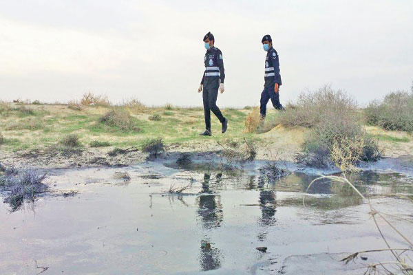 وفور ورود البلاغ إلى إدارة شرطة البيئة تعامل قسم الرقابة والتفتيش البيئي مع البلاغ، وتمت الاستعانة بمركز مبارك الكبير للمواد الخطيرة التابع للإدارة العامة الإطفاء، الذي قام بتحليل تلك المادة وتبين أنها كيميائية حارقة من المخلفات الصناعية، ولها تأثير مباشر على القدرة الإنتاجية للتربة، كما أنها تلوث الهواء، فضلا عن انتشار رائحة المادة السامة بالمكان.واعترف قائد الصهريج أن هذه المخلفات الصناعية ناتجة عن أحد مصانع البتروكيماويات التي يتعامل معها، ومن المفترض نقل هذه المواد الخطيرة إلى (محطة الوفرة لمعالجة المخلفات الصناعية السائلة). واثر ذلك قامت شرطة البيئة بإحالته إلى الهيئة العامة للبيئة، وفقاً لنص المادة 29 من قانون حماية البيئة، والتي تتضمن «حظر التخلص من النفايات بأنواعها بالردم المباشر في مواقع غير مخصصة بيئياً»، كما تنص المادة 131 من ذات القانون على «يعاقب بالحبس مدة لا تقل عن 3 سنوات ولا تزيد على 10 سنوات، وبغرامة لا تقل عن 20 ألف د.ك ولا تزيد على 200 ألف د.ك كل من خالف حكم المادة 29».