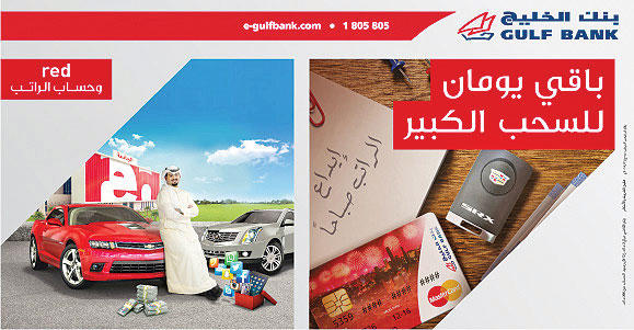أعلن بنك الخليج موعد السحوبات الشهرية لحسابي red والراتب، التي ستقام يوم الخميس المقبل، في تمام الساعة السابعة مساء بالغراند أفنيوز. ويدعو بنك الخليج الجميع إلى حضور هذه الفعالية المميزة.تشمل سحوبات حسابي red والراتب سيارة كاديلاك SRX جديدة وجوائز نقدية تصل قيمتها إلى 1.500 د.ك. بالإضافة إلى سحب حساب الراتب السنوي الذي يمنح جائزتين نقديتين قيمة كل منهما 25.000 دينار كويتي، وستجري هذه السحوبات بإشراف ممثل من وزارة التجارة والصناعة.