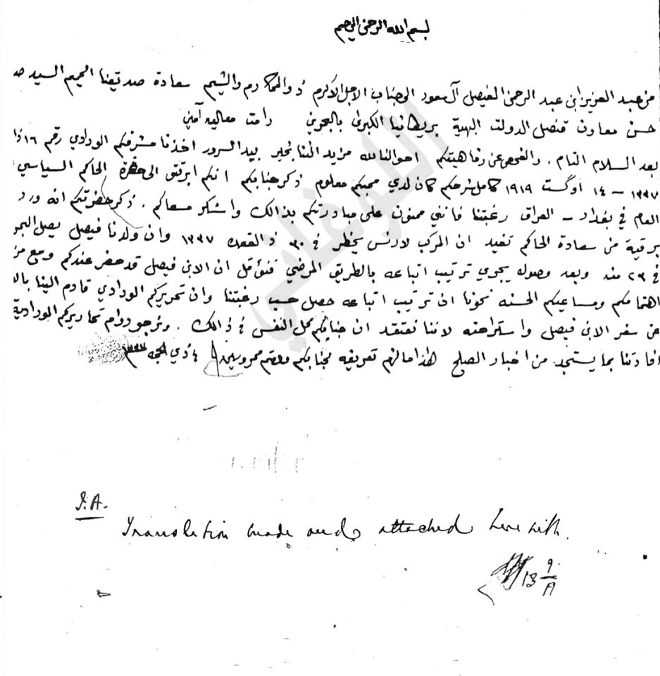 أصر حاكم نجد في ذلك الوقت، الشيخ عبدالعزيز بن سعود، على أن يرافق ابنه فيصل في رحلته إلى لندن عام 1919م مجموعة من تسعة أشخاص، فلم يجد البريطانيون بداً من الموافقة على ذلك، رغم أنهم حاولوا تقليل عدد الضيوف السعوديين، ووجدوا أنفسهم مضطرين لقبول الموقف السعودي، لذلك كتبت القنصلية البريطانية في البحرين الرسالة التالية لحاكم نجد تقول فيها:"محبكم مسرور ان اعرف سعادتكم بأن نجلكم الشيخ فيصل سلمه الله وجماعته وصلوا البحرين بالسلامة وبعد اقامة كم يوم الذي استانس فيها جدا والذي حصل منها فايدة لصحته. الجماعة يسافرون في منور الدولة البهية لارنس بتاريخ 30 اكست 1919م يوم السبت مطابق في 2 ذو الحجة 1337هـ. ان شاء الله يوصلون بمبي بتاريخ 9 ديسمبر 1919م الجاري مطابق في 13 ذو الحجة ومن هناك ايضا يركبون في المركب الى لندن من بعد اقامة يومين او ثلاثة في بمبي..".