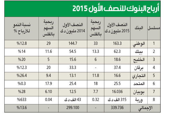 بيّنت نتائج 8 بنوك نمو أرباحها بواقع ٪13.6 للنصف الأول من العام الحالي، إذ حققت 339.7 مليون دينار مقارنة بـ 299.1 مليون عن الفترة المقابلة من العام الماضي.