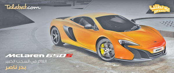 اختتم موقع طلبات- كوم، الرائد عالميا في طلب الطعام عبر الشبكة الالكترونية، حملته المتميزة "يلا نطلب" التي شملت ست دول من دول الخليج. وشارك في هذه المسابقة مطاعم عالمية واخرى محلية، وتنافس أكثر من مئة ألف مشارك يوميا مدة شهر، ليفوز في النهاية فائز واحد بجائزة لا مثيل لها في الكويت من حيث الفخامة، وهي عبارة عن سيارة ماكلارين 650S التي توج بها عميل الموقع بدر ناصر، ليحفر اسمه بذلك في قاعة الشهرة الخاصة بـ"طلبات- كوم".