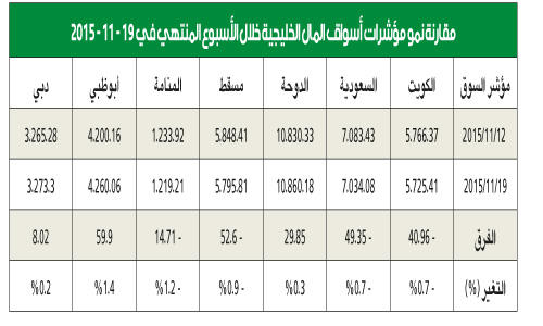 تباين أداء مؤشرات أسواق دول مجلس التعاون المالية الأسبوع الماضي. حيث ربحت ثلاثة أسواق وتراجعت أربعة. وكان أبوظبي الأفضل أداء محققاً نسبة 1.4 في المئة تلاه القطري وبنسبة قاربت ثلث نقطة مئوية ثم دبي بعُشري نقطة مئوية. وكان السوق الأصغر والأقل سيولة البحريني هو الأكثر خسارة وبنسبة 1.2 في المئة ثم مسقط بنسبة 0.9 في المئة وقريبة من نقطة مئوية وتعادل سوقا الكويت والسعودية بنسبة الخسارة التي كانت 0.7 في المئة.توقف عن النزيف في الإمارات وقطر