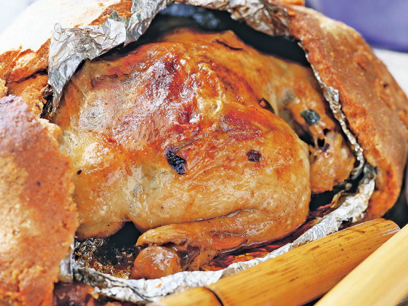 • لتتبيل الدجاجة: افردي ورقتي ألومينيوم وضعي فوقهما الدجاجة وافركيها بصلصة الصويا والزيت.• لتحضير الحشوة: ضعي في وعاء مكونات الحشوة واخلطيها حتى تتجانس، احشي الدجاجة بها وأغلقي الفتحة بواسطة أعواد الأسنان، ثم غلفيها بورق ألومينيوم واتركيها جانباً.• لتحضير عجينة الملح: في وعاء كبير، ضعي الدقيق والملح، أضيفي الماء تدريجاً للحصول على عجينة متماسكة. أفردي العجينة على صينية بعد رشها بالطحين حتى تصبح كبيرة كفاية لتغطي الدجاجة بالكامل.• في صينية فرن قصيرة الحافة ومدهونة بالزيت، افردي العجينة وضعي عليها الدجاجة المغلفة بورق ألومينيوم. ادهني أطراف العجينة بقليل من الماء لتسهيل صفها، ثم أطوي العجينة فوق الدجاجة واغلقي الأطراف بالضغط عليها لتلتصق جيداً. اشوي الدجاجة في الفرن لمدة ساعة، ثم خففي النار واتركيها 3 ساعات حتى تصبح العجينة هشة ومحمصة.• اسحبي الصينية من الفرن واكسري عجينة الملح بواسطة مدقة، ثم أزيلي ورق الألومينيوم عن الدجاجة وضعيها في طبق التقديم.قالب الدجاج المكسيكي بالفرن