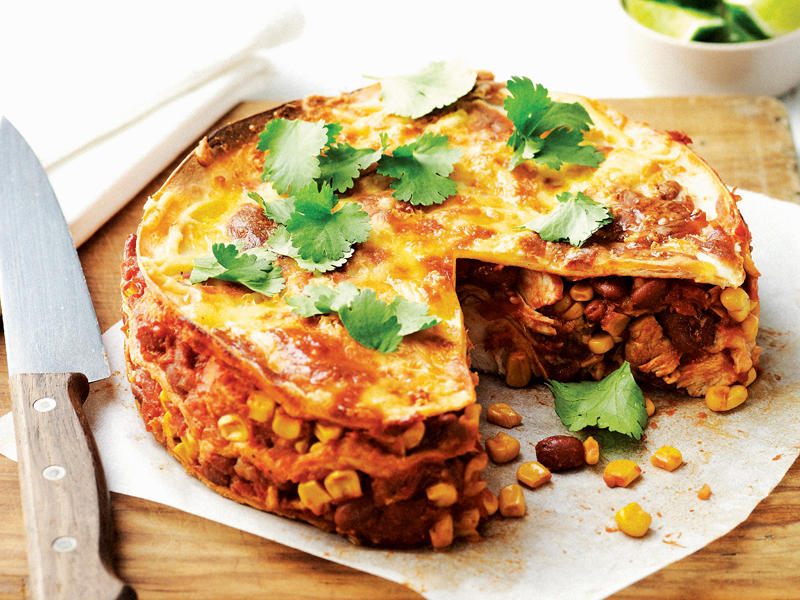 • حمّي الفرن على حرارة 220 درجة، وغلفي قاع قالب له قاعدة متحركة وجوانبه.• لتحضير الحشوة: في مقلاة كبيرة على النار، حمي الزيت واقلي البصل والفلفل وحركي حتى يذبل البصل. أضيفي الطماطم والفاصوليا والذرة والفلفل الحار والثوم المطحون والبصل المطحون ورقائق الفلفل والأوريغانو والبابريكا والكمون، وحركي الخليط. خففي النار واتركي الخليط حتى يتسبك قليلا. أضيفي الدجاج والكزبرة وحركي باستمرار، تبليه بالملح والبهار حسب الذوق وارفعيه عن النار.• لتشكيل قالب الدجاج: ضعي في قعر القالب رغيف تورتيلا واسكبي فوقه ثلث كمية خليط الدجاج. كرري العملية نفسها لتشكيل قالب على أن تكون الطبقة الأخيرة رغيف تورتيلا ورشي على سطحه جبنة موزاريلا، وضعيه في صينية فرن.• اخبزي القالب نحو 20 دقيقة حتى يصبح سطحه ذهبياً. اخرجيه من الفرن واتركيه جانباً ليبرد قليلا ثم قطعيه وقدميه.تارت البصل وجبنة الشيدر