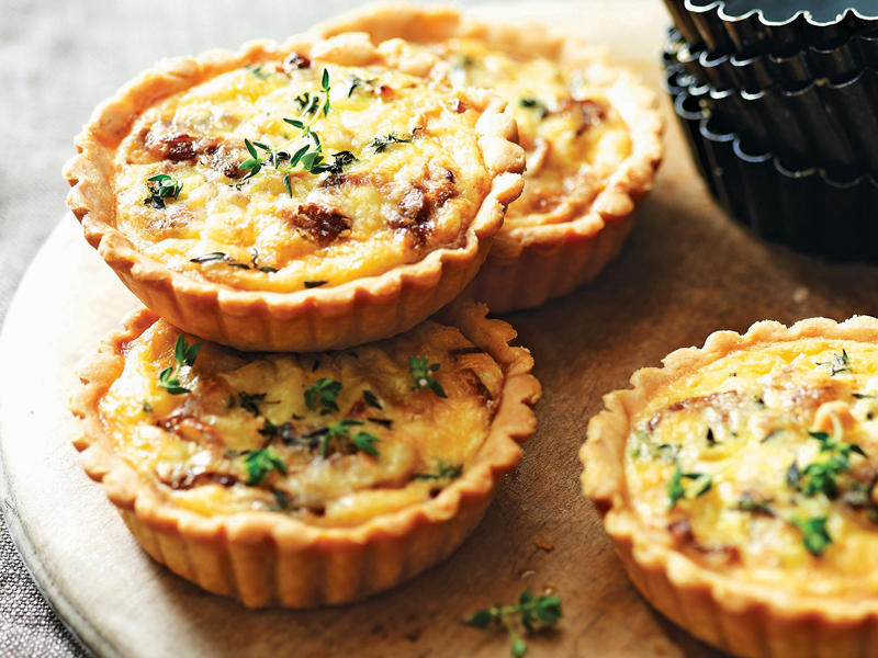 • ملعقة كبيرة من زيت الزيتون.• بصلتان مقطعتان جوانح رفيعة.• 4 بيضات.• ¾ كوب من الكريما السائلة للطبخ.• ¾ كوب من جبنة الشيدر مبروشة ناعماً (80 غ).• ملعقة ونصف ملعقة صغيرة من أوراق الزعتر الخضراء.• للخبز 6 قوالب كيك بقاعدة متحركة، قطر الواحد 9 سنتم مدهونة بالزيت.الطريقة: