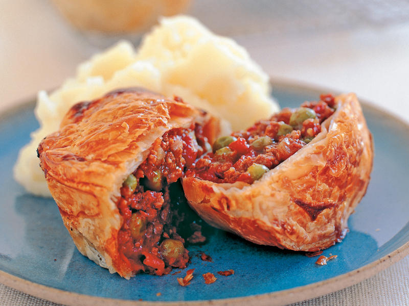 • لتحضير الحشوة: في مقلاة كبيرة على النار حمي الزيت واقلي البصل وحركيه حتى يذبل. أضيفي اللحم وحركيه باستمرار حتى ينضج. أضيفي الطماطم ومعجون الطماطم وصلصة الباربكيو والمرق وحركي الخليط حتى يغلي. خففي النار واطهي الخليط غير مغطى نحو 20 دقيقة حتى تتسبك الصلصة. ارفعي المقلاة عن النار وأضيفي البازلاء وحركي الحشوة ثم ارفعيها عن النار واتركيها لتبرد.• حمي الفرن على حرارة 200 درجة مئوية وادهني صينية مافن بالزيت فيها 6 قوالب.• لتحضير العجينة: على سطح مرشوش بالدقيق افردي رقائق الباف باستري. في كل رقاقة قطعي دائرتين بواسطة قطاعة دائرية صغيرة للحصول على 6 دوائر صغيرة.• لتشكيل الفطائر: غلفي كل قالب بدائرة عجين كبيرة واضغطي عليها لتغطي قاعه وجوانبه. مرري سكيناً أفقياً على حافة القوالب لإزالة العجين الزائد، ثم اسكبي كل قاعدة بخفة بواسطة شوكة، واحفظي الصينية في الثلاجة لمدة 30 دقيقة. غطي دوائر العجينة الصغيرة بفوطة رطبة واتركيها جانباً.• اسحبي الصينية من الثلاجة وغلفي كل قالب بورقة زبدة ثم املئيه بحبوب الفاصوليا أو الأرز واخبزي الصينية لمدة 10 دقائق. اسحبي الصينية من الفرن وأفرغيها من الحبوب ثم ارفعي عنها ورق الزبدة واتركي القوالب لتبرد.• بواسطة ملعقة اسكبي خليط اللحم في القوالب. ادهني أطراف العجينة بقليل من البيض لتسهيل لصقها، ثم غطي كل قالب بدائرة عجين صغيرة واضغطي على الأطراف برفق لتلتصق جيداً.• ادهني سطح العجينة بقليل من البيض واخبزي القوالب غير مغطاة نحو 15 دقيقة حتى تصبح العجينة ذهبية اللون. اسحبي القوالب من الفرن واتركيها في الصينية لمدة 5 دقائق لتبرد. اسحبي الفطائر من القوالب وضعيها في طبق التقديم وقدميها مع البطاطا المهروسة، حسب الرغبة.قالب كيك بالمكسّرات