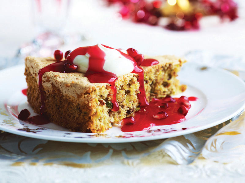 • كوب من اللوز.• كوب من الفستق الحلبي المقشور غير مملّح.• 4 بيضات، مفصولة.• ¾ كوب من السكّر.• كوب من اللوز المطحون.• ملعقتان كبيرتان زبدة مذابة (40 غرام).• قالب كيك دائري عميق قطره 25 سنتم.صلصة الرمان