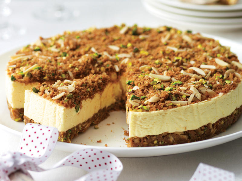حضّري هذا الكيك قبل يوم من تقديمه.طبقة البسكويت والتزيين• 1/3 كوب من الجوز.• 2/3 كوب من الفستق الحلبي.• ملعقة صغيرة من القرفة المطحونة.• ½ ملعقة صغيرة من جوزة الطيب المطحونة.• ½ ملعقة صغيرة من البهار الحلو.• 2 ½ كوب من البسكويت المكسّر.• ½ كوب من اللوز، شرحات طويلة.• ½ كوب من الزبدة المذابة (125 غ).• قالب كيك دائري له قاعدة متحركة قطره 26 سنتم.طبقة الجبنة