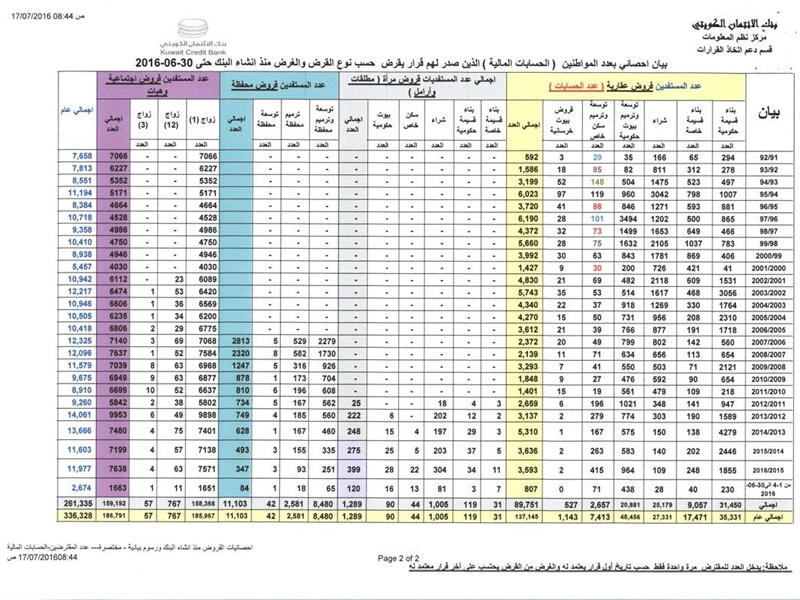 وعن آخر مستجدات البنك أوضح أن «الائتمان الكويتي» سيطلق خدماته عبر الهاتف النقال بما يمكن العملاء من الحصول على كشف الحساب الخاص بهم ودفع الأقساط إلكترونياً والتقدم بطلب دفعة جديدة أو التقدم بطلب دعم المواد دون حاجة إلى مراجعة أي من الفروع توفيراً للوقت والجهد وتقليصا للدورة المستندية. وذكر المضف أن الإنجازات الإلكترونية للبنك جاءت بناء على توجيهات مجلس الوزراء في مجال الحكومة الإلكترونية، ومن إنجازات «الائتمان الكويتي» في هذا المجال تدشين قرض الزواج إلكترونياً الذي مكن المواطن من الحصول على قرضه أينما كان بسهولة ويسر عبر الإنترنت، لافتاً إلى أن البنك هو المؤسسة الأولى والوحيدة في الكويت التي قامت بعملية الربط الإلكتروني المركب مع جهات الدولة والتي تم من خلالها تدشين القرض العقاري.وبالنسبة إلى مشاريع البنك أفاد بأنه تم توقيع عقد المتابعة والإشراف على تنفيذ مشروع مبنى المقر الرئيسي للبنك في جنوب السرة لإدارة المشروع وانجازه على الوجه الأكمل وفي التوقيت المحدد وفق الاشتراطات والمواصفات الفنية باعتباره أحد أهم المشروعات المدرجة في ميزانية البنك.وعن مسيرة البنك التاريخية أوضح أنه وفق البيان الإحصائي التجميعي منذ إنشاء البنك حتى مطلع يوليو الجاري فقد بلغ المنصرف كقروض ومساعدات سبعة مليارات و817 مليوناً و666 ألف دينار كويتي (الدولار يعادل 0.302 دينار) لنحو 360 ألفاً و285 مستفيداً وقد نجح البنك في تحصيل ما نسبته 53 في المئة من المنصرف لتدور الدورة ويستفيد آخرون من عطاء الدولة فيؤسسون بيوت العمر أو مشروعات المستقبل فيتعاظم بذلك الإحساس بالأمان لديهم في وطن الأمن والأمان فتم تحصيل أربعة مليارات و174 مليوناً و107 آلاف دينار.وذكر المضف أن مجمل هذا النشاط تم بسلاسة ويسر وكانت ثمرة الجهود المبذولة من العاملين جميعاً حصول البنك على جائزة أفضل «المشروعات الذكية لمدن المستقبل» في المؤتمر الهندسي لدول مجلس التعاون الخليجي فضلاً عن حصوله على جائزة الكويت للمحتوى الإلكتروني عن إطلاقه خدمة القرض «أون لاين» الذي تم برعاية وحضور سمو أمير البلاد الشيح صباح الجابر الأحمد الصباح حفظه الله ورعاه.المرأة