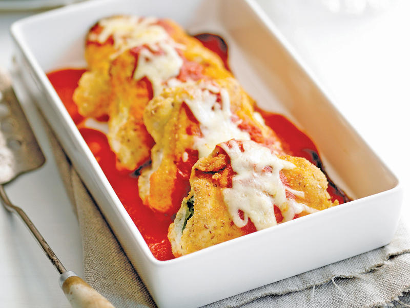 • حمي الفرن على حرارة 200 درجة مئوية.• لتحضير الدجاج: قطعي كل صدر دجاج إلى نصفين بالعرض من أحد جوانبه من دون فصل النصفين. افتحي كل صدر دجاج كالكتاب وضعيه بين طبقتين من ورق النايلون ثم دقيه حتى تصبح كل صدور الدجاج رقيقة ومتساوية في السماكة.• لحشو الدجاج: انزعي الطبقة العليا من النايلون. على أحد نصفي صدر الدجاج ضعي ¼ كمية الجبنة البيضاء. اطوي النصف الثاني ليغطي الحشوة واضغطي عليه جيداً. ثبتي النصفين بأعواد أسنان، إذا دعت الحاجة. كرري العملية لحشو باقي صدور الدجاج بأوراق السبانخ والجبنة البيضاء.• لتغليف الدجاج: أولاً، غلفي الدجاج المحشو بالدقيق من الجانبين. في وعاء اخفقي البيض والحليب حتى يتجانس الخليط. غمسي قطع الدجاج الواحدة تلو الأخرى في خليط البيض. أخيراً غلفيها بالقسماط تماماً من الجانبين واحفظيها جانباً.• في مقلاة على نار متوسطة، حمي الزيت واقلي صدور الدجاج المغلفة حتى تصبح ذهبية اللون وتنضج جيداً. ارفعيها عن النار وصفيها على طبق مغطى بورق الطبخ.• لتشكيل صينية البارميجانا: في صينية فرن، صفي قطع الدجاج المقلية ووزعي عليها صلصة الطماطم الجاهزة، ثم رشي جبنة الموزاريلا على الصلصة. اخبزي البارميجانا في الفرن نحو 10 دقائق حتى تذوب الجبنة، ثم اسحبيها من الفرن وقدميها ساخنة.دجاج بالفلفل الأحمر