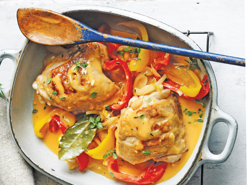 • ملعقتان كبيرتان من زيت الزيتون.• 4 قطع من أفخاذ الدجاج (800غ).• بصلتان مقطعتان إلى جوانح رفيعة.• 3 فصوص من الثوم المهروس.• حبتا فلفل أحمر مقطعتان إلى شرائح عريضة.• حبتا فلفل أصفر مقطعتان إلى شرائح عريضة.• ملعقة كبيرة من معجون الطماطم.• 1/3 كوب من الخل.• 1/3 كوب من مرق الدجاج.• ورقتا غار.• 4 أعواد من الزعتر الأخضر.• ملعقتان صغيرتان من الزعتر الأخضر المفروم ناعماً للتزيين.الطريقة: