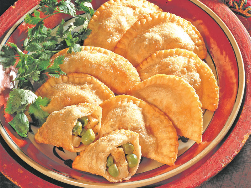 • كوب ونصف من الدقيق المنخول.• ملعقة كبيرة من زيت الذرة. • كوب من الماء. • زيت نباتي للقلي.الحشوة• حبتا بطاطا مسلوقتان ومفرومتان ناعماً.• ¾ كوب من البازيلاء المجمدة.• ملعقة صغيرة من الكمّون المطحون.• ½ ملعقة صغيرة من البهار الحلو البودرة.• ½ ملعقة صغيرة من القرفة المطحونة.• ملعقتان كبيرتان من الزبيب.• ملعقة كبيرة من الكزبرة الخضراء المفرومة.• ملعقتان كبيرتان من عصير الليمون الحامض.• ملعقة كبيرة من الصويا.الطريقة: