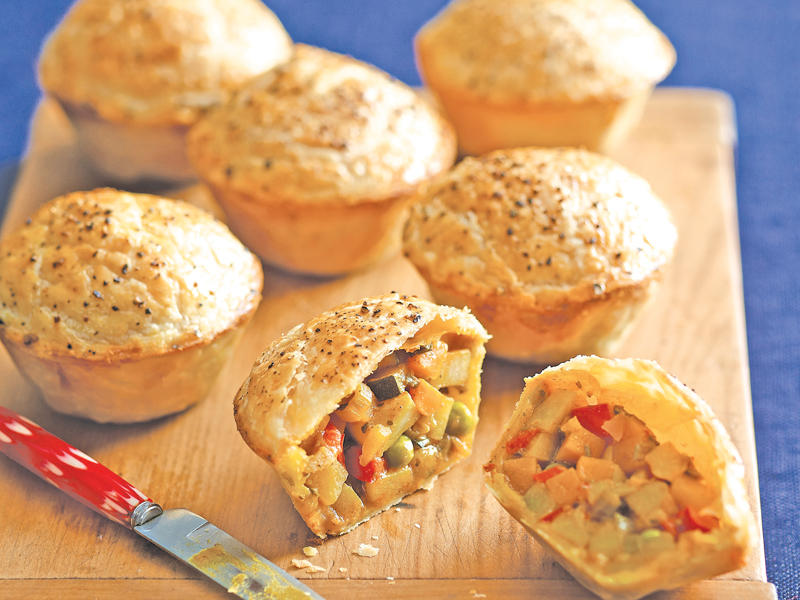 • 3 رقائق من عجينة شورت كرست.• رقاقتان من عجينة باف باستري.• بيضة مخفوقة قليلا.• ملعقة صغيرة من الفلفل الأسود المجروش للتزيين. الحشوة• ملعقة كبيرة من الزيت النباتي.• حبتا بصل أخضر مقطعتان إلى شرائح صغيرة.• قرن فلفل حلو أحمر مفروم ناعماً.• حبة بطاطا مفرومة ناعماً.• حبة كوسا مفرومة ناعماً.• حبة جزر مفرومة ناعماً.• 1/3 كوب كاري.• كوبان من مرق الخضراوات.• 125 غراماً من حبوب الذرة المعلبة والمصفاة.• نصف كوب من البازيلاء المجمدة.الطريقة: