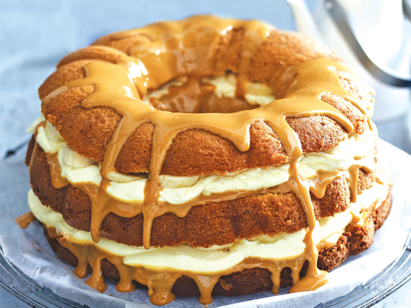 الكيك• ¾ كوب من الزبدة اللينة (190 غ).• كوب وربع كوب من السكّر.• ملعقتان صغيرتان من الفانيليا السائلة.• 3 بيضات.• كوب ونصف كوب من الموز المهروس (موزتان كبيرتان ناضجتان).• كوبان وربع كوب من الدقيق المنخول.• 3 ملاعق صغيرة من البيكينغ باودر.• ½ ملعقة صغيرة من بيكربونات الصودا. • نصف كوب من الحليب السائل.• قالب كيك دائري له فتحة في الوسط قطره 24 سنتم.خليط جبنة الكريما• كوبان من جبنة الكريما (500غ).• ¾ كوب من كريما الخفق.التزيين• كوب ونصف كوب من صلصة الكراميل الجاهزة، مبردة.• موزة كبيرة مقطعة إلى شرائح رفيعة.• ملعقة كبيرة من الماء المغلي.الطريقة:
