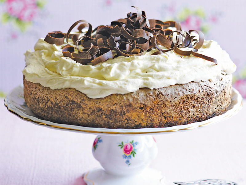 الكيك• بياض 3 بيضات.• ½ كوب من السكّر. • كوب من اللوز شرحات طويلة، مفروم ناعماً.• ¾ كوب من التمر المفروم ناعماً.• كوب من الشوكولاتة السوداء المبروشة.• قالب كيك دائري له قاعدة متحركة قطره 23 سنتم.التزيين• كوب وثلاثة أرباع من كريما الخفق.• ½ كوب من الشوكولاتة السوداء المبروشة.الطريقة: