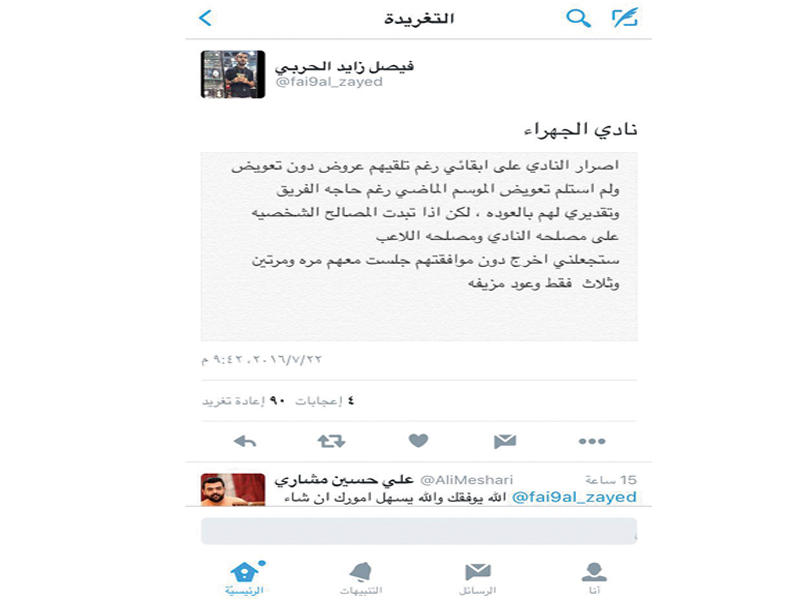 وفي نفس السياق، حمل مهاجم نادي الجهراء الدولي فيصل زايد إدارة ناديه المسؤولية كاملة عن لجوئه إلى فكرة الخروج الى الاحتراف من دون رغبتهم.وقال زايد في تصريح لـ"الجريدة"، حيث يتواجد حاليا في اسبانيا، إن "إصرار النادي على التمسك بخدماته رغم وجود العديد من العروض الاحترافية، سيعجله يسلك طريق الاحتراف رغما عنهم"، مضيفا ان "إدارة الجهراء وعدته مراراً بتعويضه ماديا عن تلك العروض، وهو ما لم يحدث". وانتقد زايد أعضاء مجلس الإدارة، مؤكدا أنهم يقدمون مصلحتهم على مصلحة النادي ومصلحته، بعد أن قدموا وعوداً زائفة لم يتحقق شيئا منها، مؤكد أن قراره بالرحيل وخوض تجربة للاحتراف لا رجعة فيه.وأكد انه يملك في الوقت الحالي أكثر من عرض، يفاضل بين افضلهم، وسيحسم امره بعد عودته إلى الكويت.وكان زايد قد وجه رسالة مماثلة الى نادي الجهراء، عبر حسابه على "تويتر"، تؤكد ما تم ذكره في تصريحه لـ"الجريدة".الجدير بالذكر أن زايد خاض تجربة احترافية في الدوري السعودي الموسم الماضي، بيد أنه عاد سريعاً لعدم تأقلمه مع فريقه.