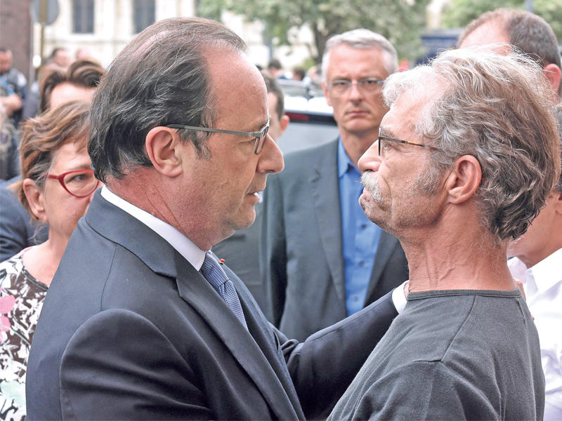 ووصف الرئيس الفرنسي فرانسوا هولاند، الذي يتحدر من روان، الاعتداء الهمجي بأنه «جريمة دنيئة»، مؤكداً أن تنظيم «داعش» يقف وراءه، وذلك بعد زيارته الى الكنيسة برفقة وزير الداخلية برنار كازانوف. وقال هولاند في باحة الكنيسة، وتبدو عليه علامات التأثر: «يجب أن نوحد صفوفنا للوقوف أمام التهديدات»، وأضاف: «أعلن داعش الحرب علينا، ويجب أن نخوض هذه الحرب بكل السبل، مع احترام سيادة القانون... فهو ما يجعلنا دولة ديمقراطية».وأعرب رئيس الوزراء مانويل فالس عن «الصدمة من الاعتداء الهمجي»، وكتب على حسابه على موقع «تويتر»: «فرنسا بكاملها وكل الكاثوليك تحت الصدمة في مواجهة الاعتداء الهمجي على الكنيسة نقف متكاتفين معاً».