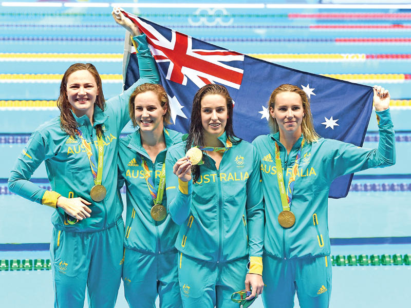 وقادت الأسترالية كايت كامبل فريق بلادها لإحراز ذهبية سباق 4 مرات 100 م حرة وحطمن الرقم العالمي الذي كان بحوزتهن.وسجلت أستراليا 3.30.65 دقائق، ماحية رقمها السابق (3.30.98 د) المسجل في غلاسكو في يوليو 2014.ونال الفضية منتخب الولايات المتحدة (3.31.89 د)، والبرونزية منتخب كندا (3.32.89 د).ومنذ تفوقها على هولندا في لندن 2012، تابعت أستراليا مسارها التصاعدي، وحسنت الرقم القياسي العالمي، من خلال لقب بطولة العالم 2015، ثم حطمته مجددا في ريو.وتصدرت الولايات المتحدة السباق بعد 200 م، لكن مع دخول برونتي كامبل، شقيقة كايتي، تقدمت الأولى على دانا فولمر. وأنهت كايت، السباحة الاسرع في العالم في سباق 100 م حرة، المهمة امام ليديكي، التي لا يعتبر سباق 100 مرة من أبرز اختصاصاتها.وفي 400 م حرة للرجال، هزم السباح الأسترالي ماكنزي "ماك" هورتون غريمه الصيني يانغ سون.وسجل هورتون 3.41.55 دقاق، مقابل 3.41.68 دقائق لسون، فيما توج الايطالي غابرييلي ديتي بالبرونزية (3.43.49 د). وهذه أول ميدالية لهورتون (20 عاما). وتقدم البريطاني جيمس غاي في أول 100 م، واحتفظ بصدارته امام الأميركي كونور دواير وهورتون. وبقي متصدرا بعد 300 م، لكن المنافسة ارتفعت مع دخول سون على الخط.وفي آخر 100 م، بدا الصراع قويا بين هورتون ويانغ حسمه الأول، وانزل الصيني عن عرشه الأولمبي عندما سجل 3.40.14 د.والرقم العالمي مسجل باسم الالماني بول بيدرمان (3.40.07 د) سجله في روما عام 2009. وقال هورتون بعد فوزه "في السباقات النهائية الاهم، هو لمس الحائط أولا، كنت اراقب الجميع في السباق". وعن منافسته اللدودة مع سون، اضاف "الامر يتعلق أكثر برياضيين رسبوا في فحص المنشطات".أما يانغ، فقال: "للأسف، لقد تدربت كثيرا. هناك ضغط كبير علي، لذا فإن الوقوف على المنصة يريحني قليلا". وعن علاقته بهورتون الذي اتهمه يوم السباق بالغش وتعاطي المنشطات، رد: "لا اتحدث اليه كثيرا".تألق هاغينو